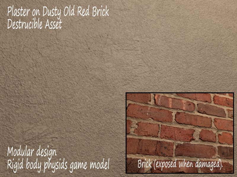 Plaster on dusty old red brick Destructible Asset, (Modular rigid body physics model) Base non-fractured and pre-cut fractured models, in FBX file format. Materials diffuse color maps, specular maps, tangent space normal maps, gloss maps 4096x4096. Support graphs built for impact damage and world support. Also includes Unreal engine 3 UDK map template, setup ready to play. Powered by Unreal Engine 3 and Nvidia PhysX. Prerequisites: UDK. You can Download UDK free here https://drive.google.com/open?id=1l3g53cct3JWMWihS5kwjXow287USzade
