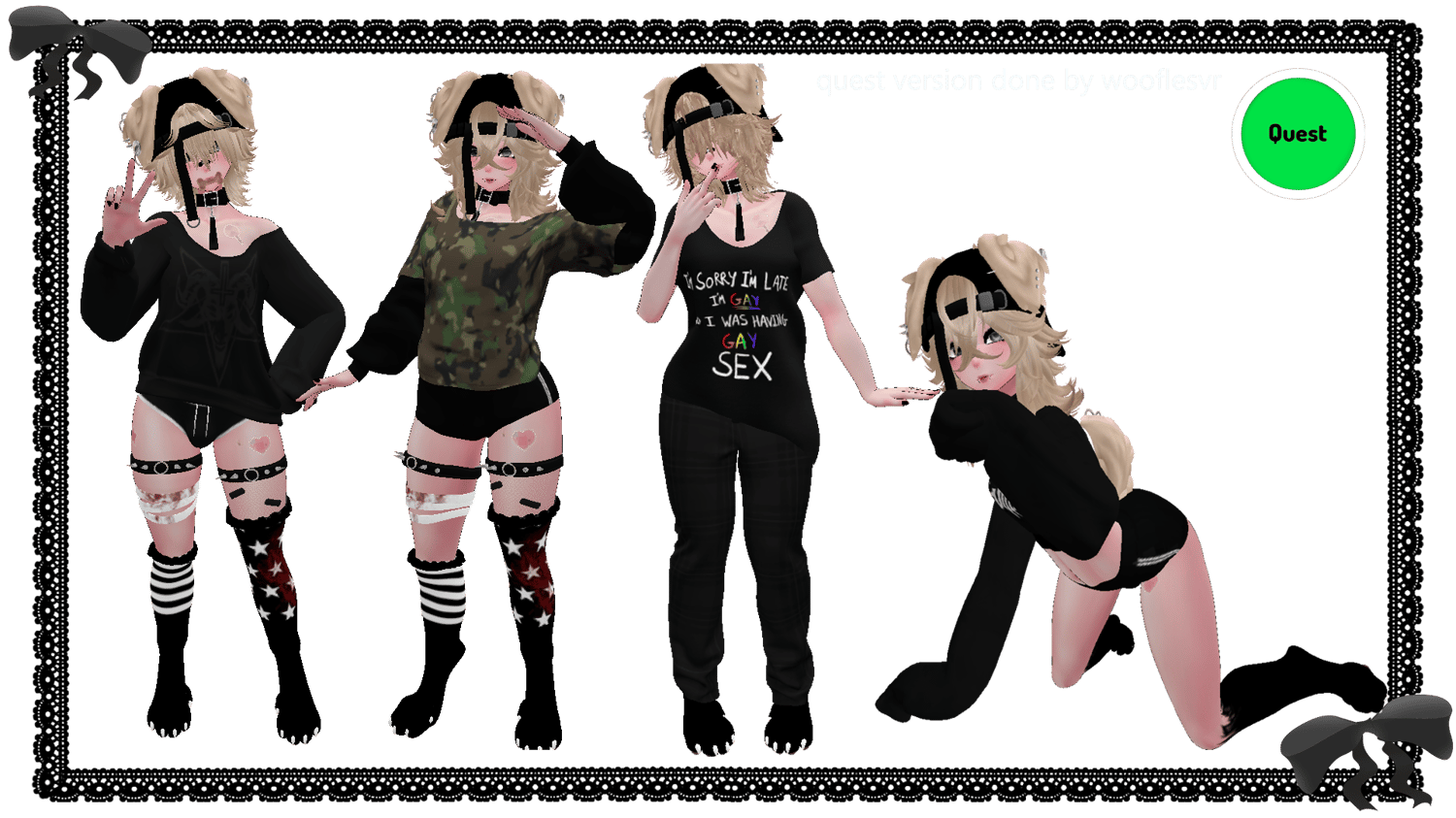 PC/Quest, VRCFT SOON, GoGoLoco, VERY expressive emotes, hair swaps, many outfits, and fun toys to express yourself!