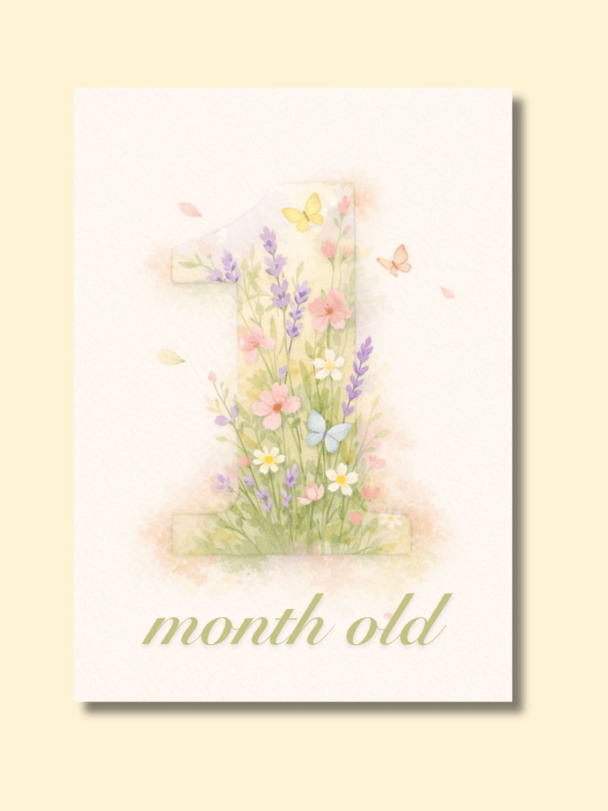 Print a card. Place it next to your baby on a blanket, crib sheet, or soft rug. Snap a photo from above. That's it. The best milestone photos are the ones where your baby is just being themselves — wiggly, sleepy, curious, mid-yawn.