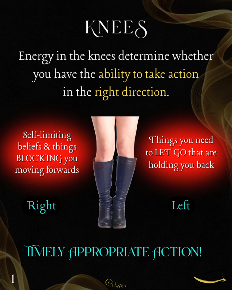 Whilst your feet guide you unconsciously toward your purpose, your knees determine whether you have the ABILITY to consciously TAKE ACTION towards your life purpose, or if you're meeting resistance along the way.