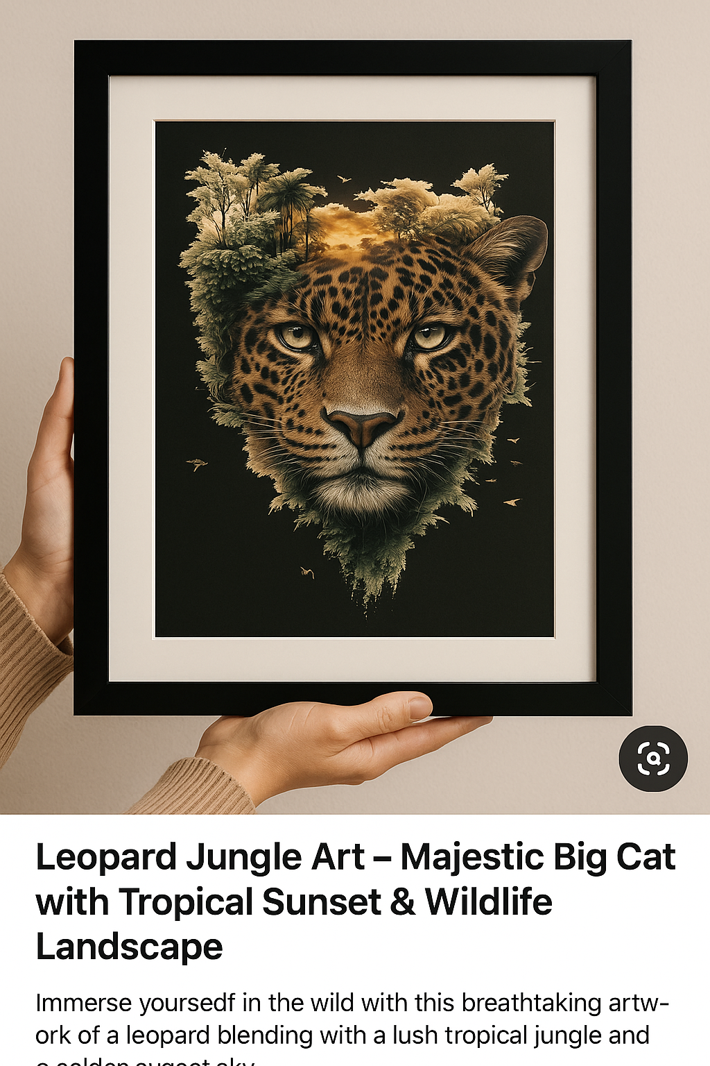 Immerse yourself in the wild with this breathtaking leopard artwork, blending the fierce beauty of a big cat with the lush greenery of a tropical jungle and a golden sunset sky. Perfect for wildlife enthusiasts, jungle art collectors, and nature-inspired décor. Ideal for wall art, t-shirt designs, posters, mugs, and home décor. This high-quality digital art print captures the essence of exotic wildlife and makes a unique gift for animal lovers.