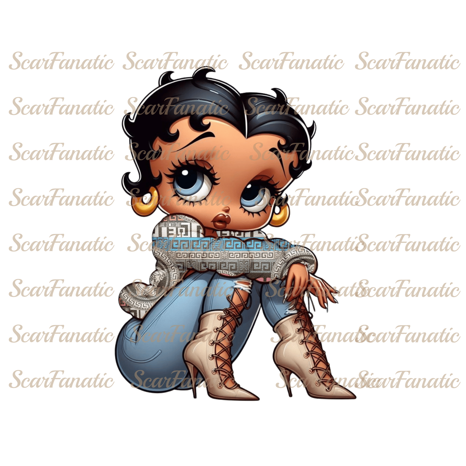 Betty Boop w blue eyes in colorful Vsc jacket, blue jeans, high heel boots, Sublimation, PNG, DTF, 300DPI, high resolution