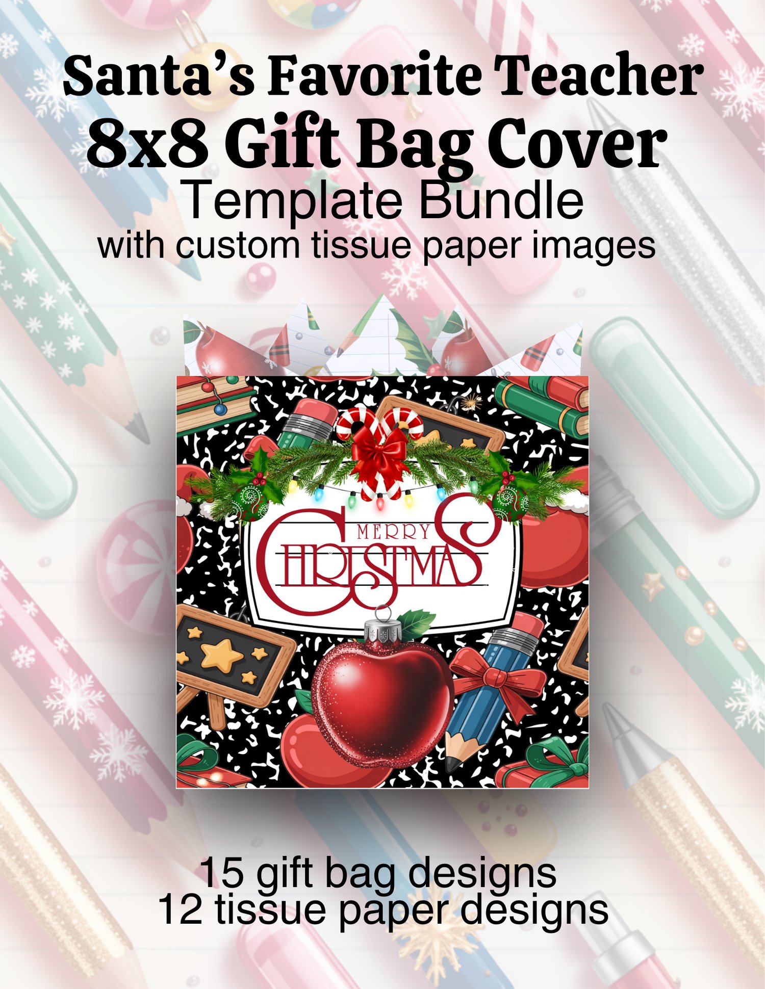 Give your teacher gifts a festive upgrade with this Christmas themed 8x8 Gift Bag Cover Template Bundle. Designed with bold holiday graphics, school inspired details and coordinating custom tissue paper images, this bundle makes it easy to create standout gift packaging that looks professionally made.