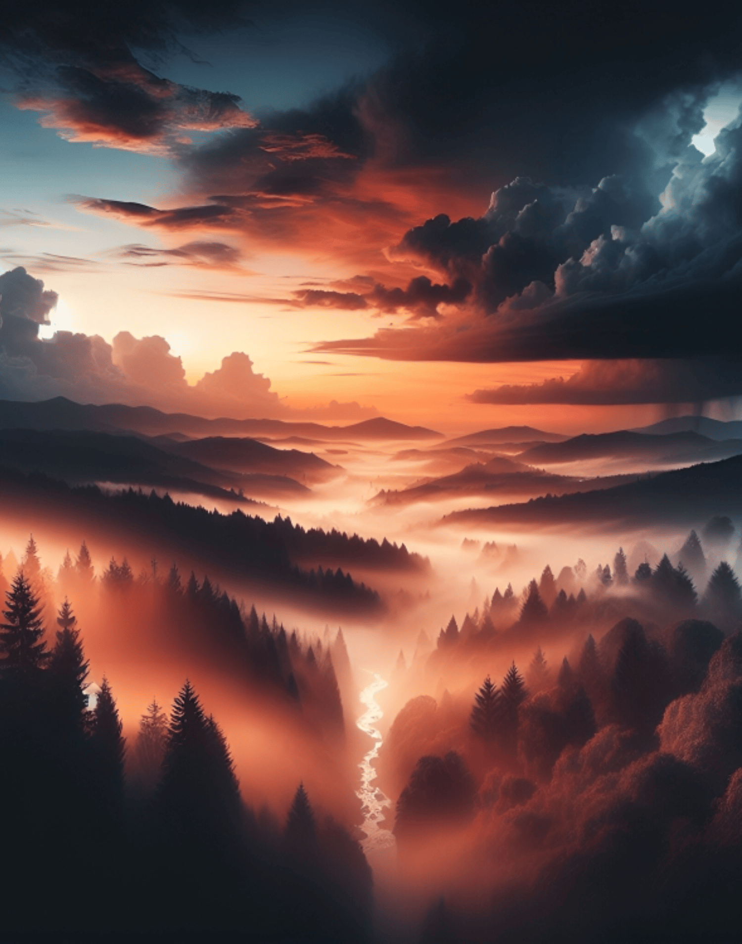 Sunset, Dusk, Lake Sunset, Vintage Landscape, Nostalgic Nature, Cool Nature, Rustic natural Landscape, Painting, Mountain, Forest