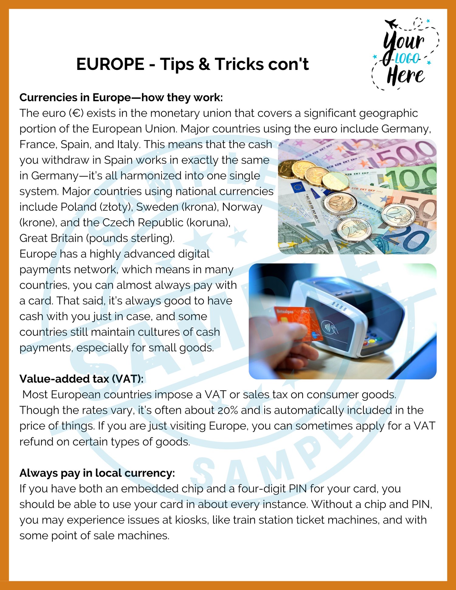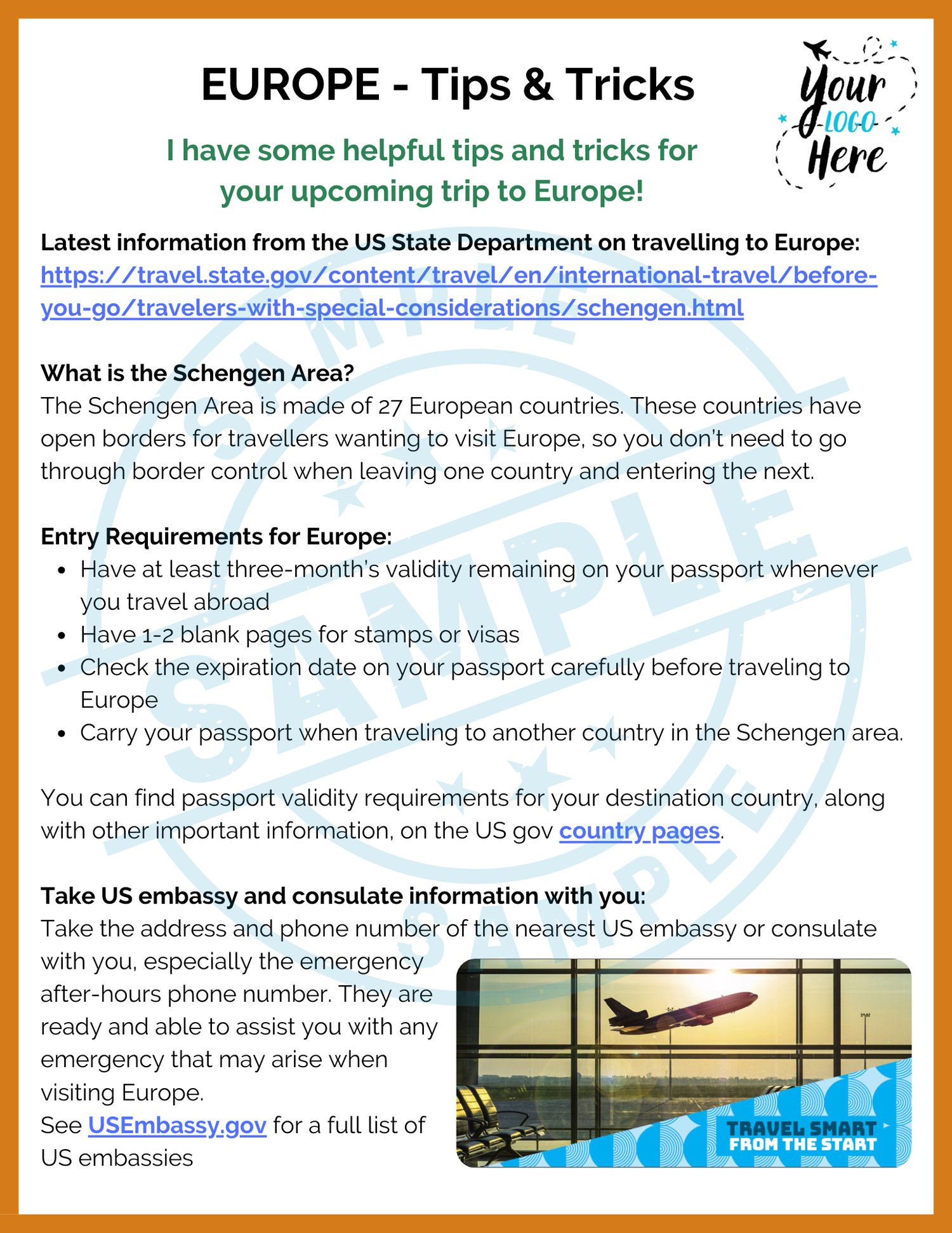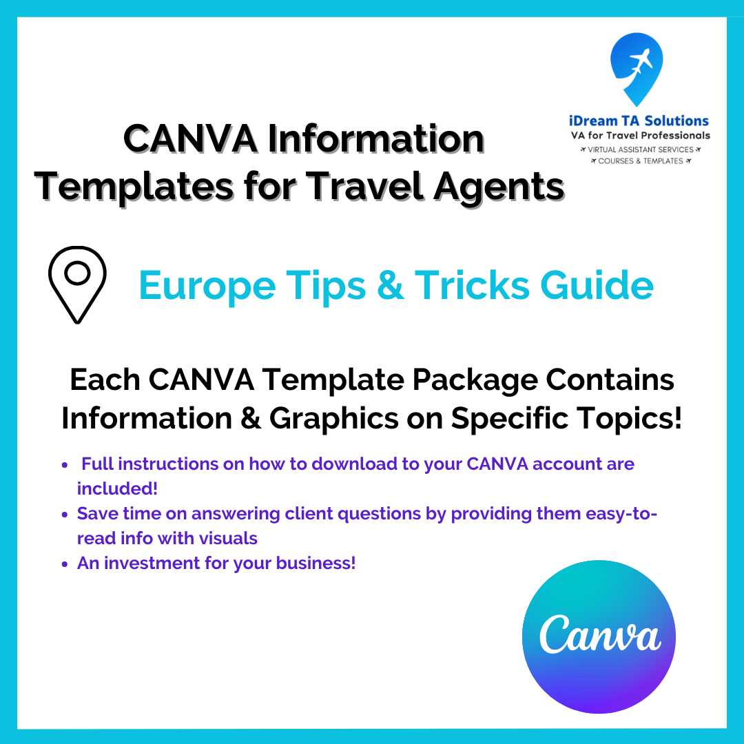 Ready-to-use CANVA templates that cover essential Tips & Tricks for Europe travel! Ensures your clients have all of the information in a logical, easy-to-read format with graphics.