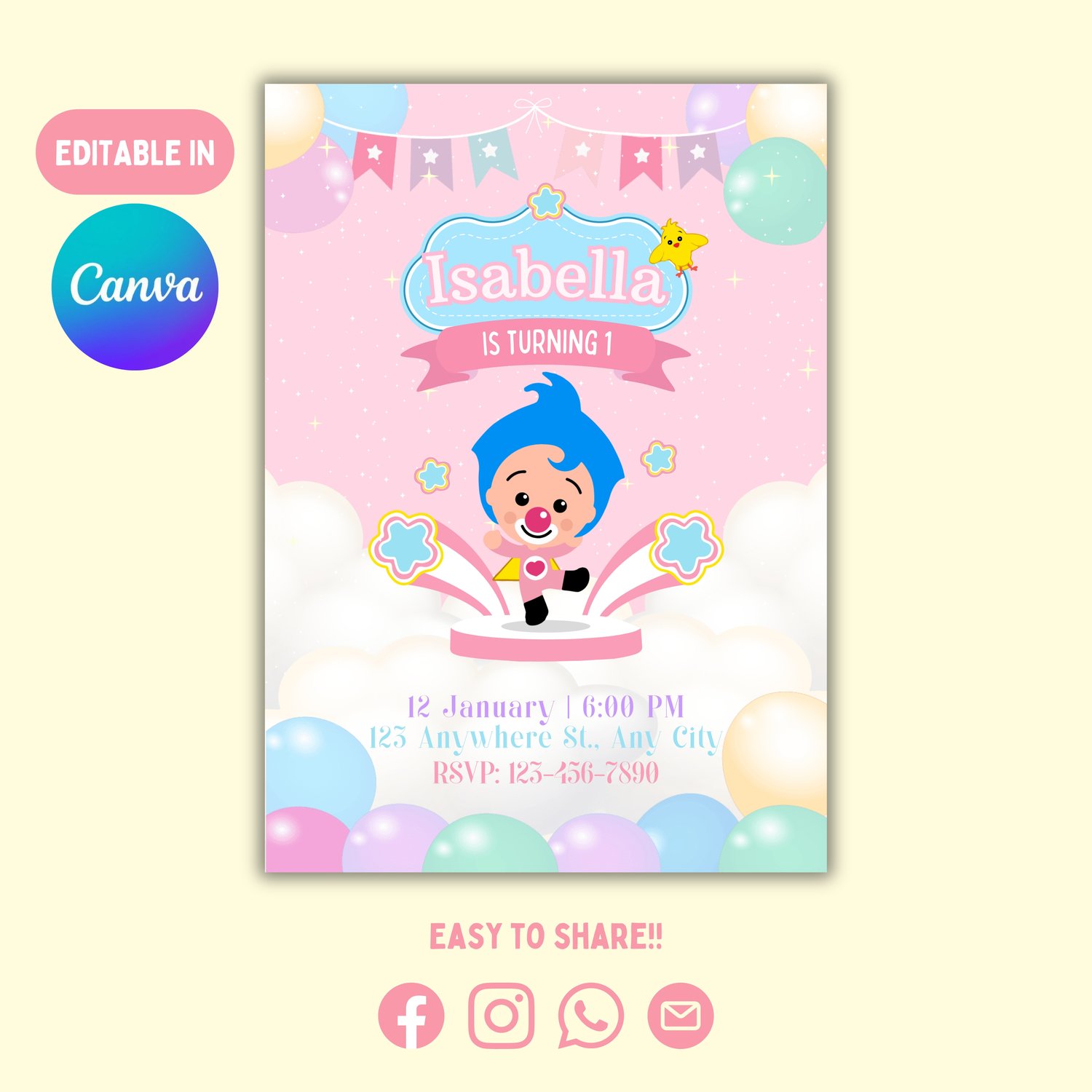Invitación de Cumpleaños Editable Plim Plim Rosa Pastel (Canva)