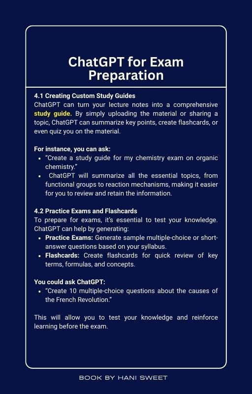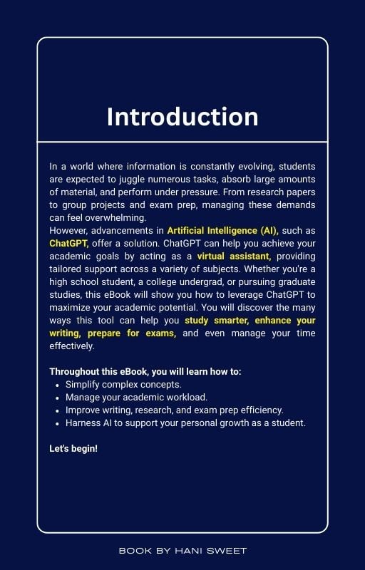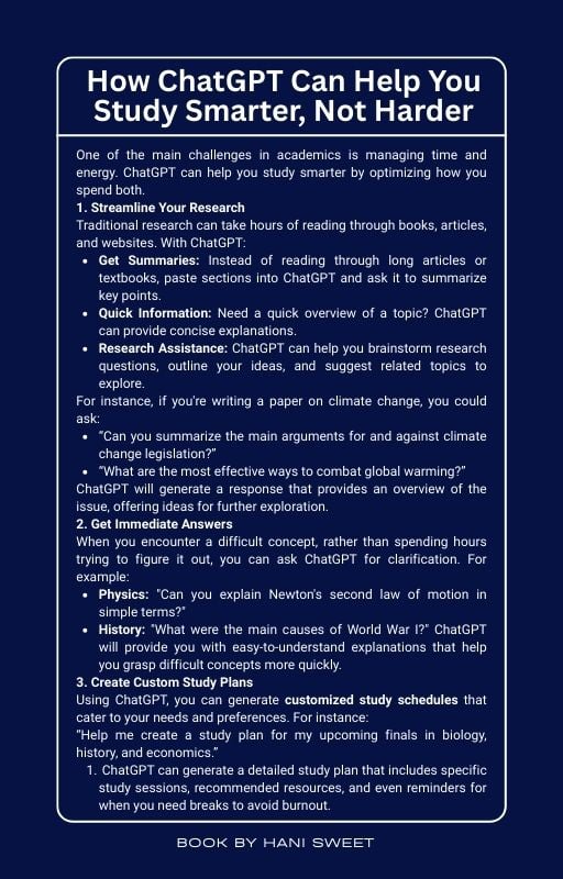 ChatGPT is an AI-powered study tool designed to help students learn faster, study smarter, and stay organized. Whether you need help understanding complex topics, writing essays, solving math problems, or preparing for exams, ChatGPT offers clear explanations, instant feedback, and personalized support. It can also generate study guides, quiz questions, summaries, and more—making it the perfect digital companion for students at any level.