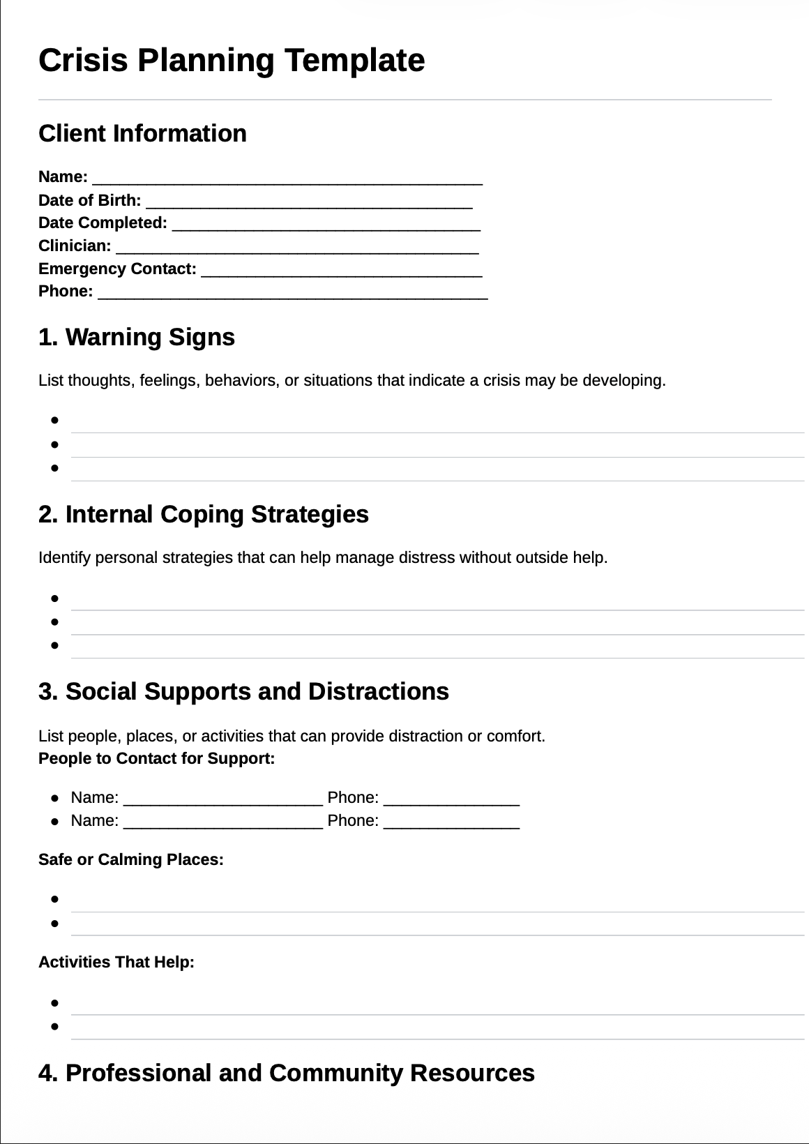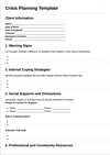 The template guides clinicians and clients through essential components of effective crisis planning, including: