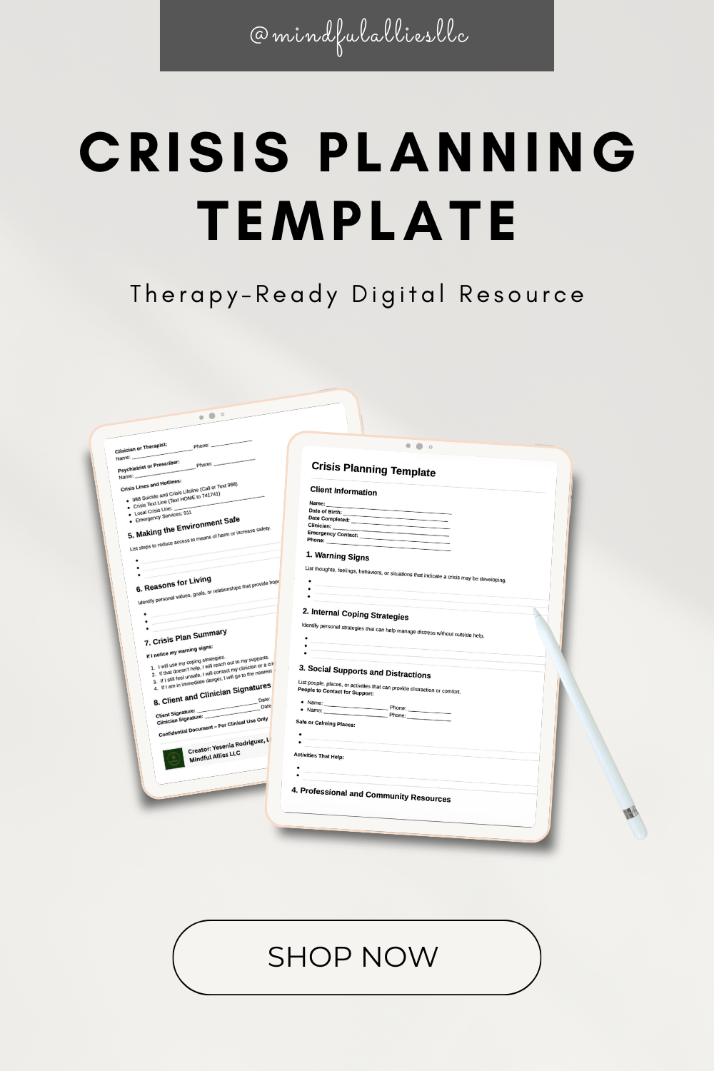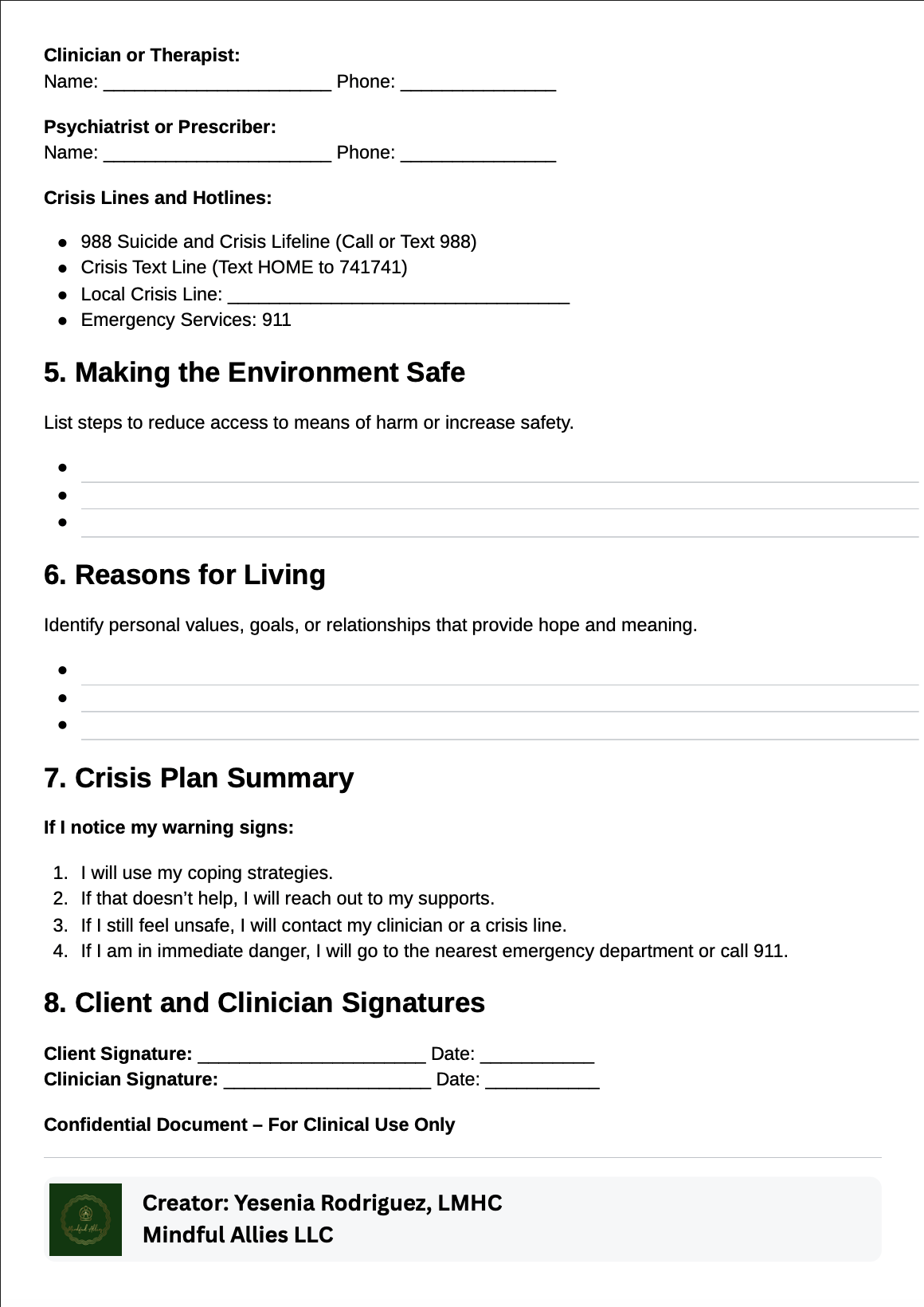 This Crisis Planning Template is provided as a supportive clinical tool intended for use by licensed mental health professionals or qualified clinicians within the scope of their professional training and licensure. It is designed to be completed collaboratively with clients and should be used as part of ongoing clinical care.