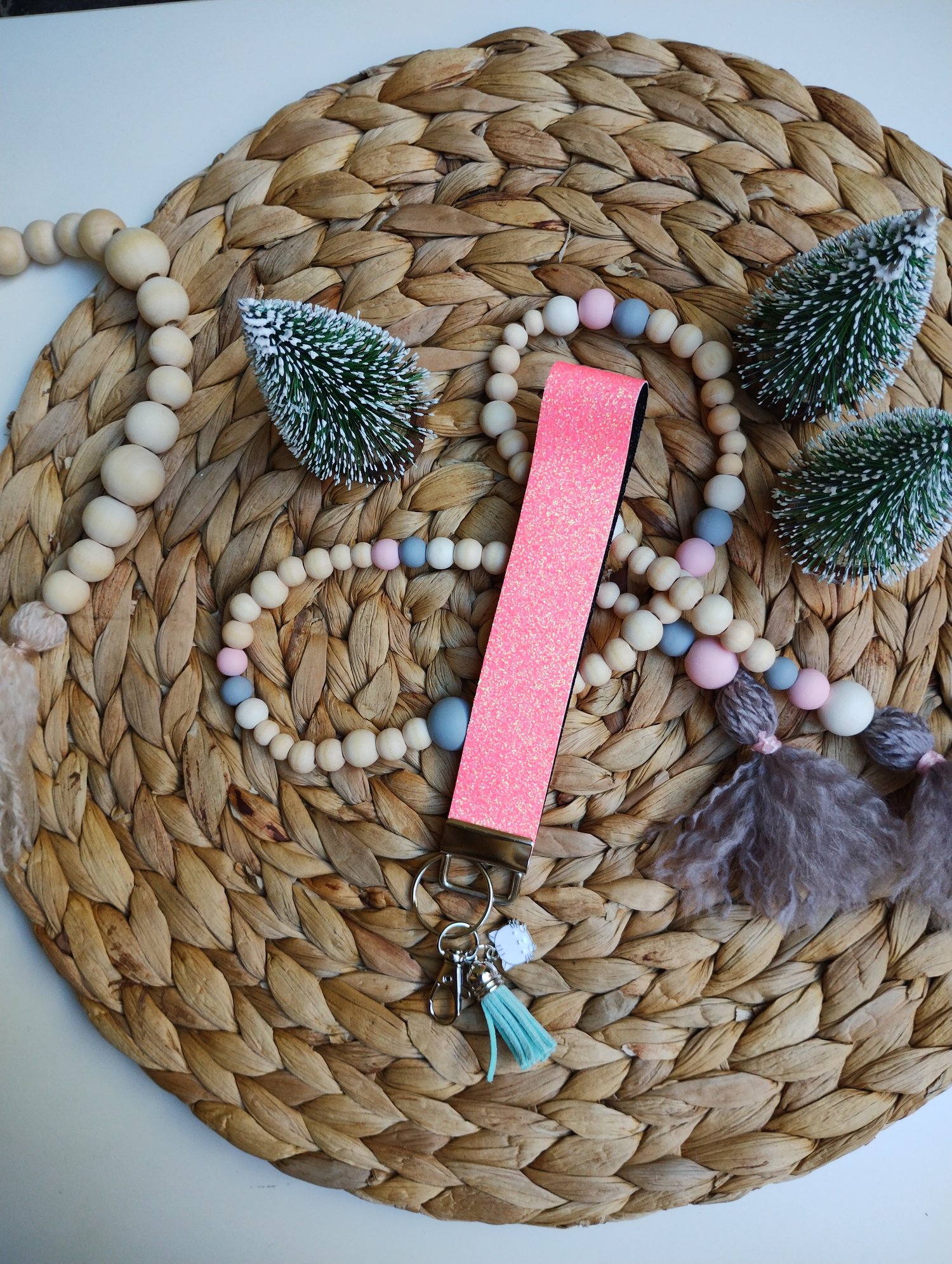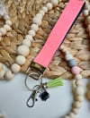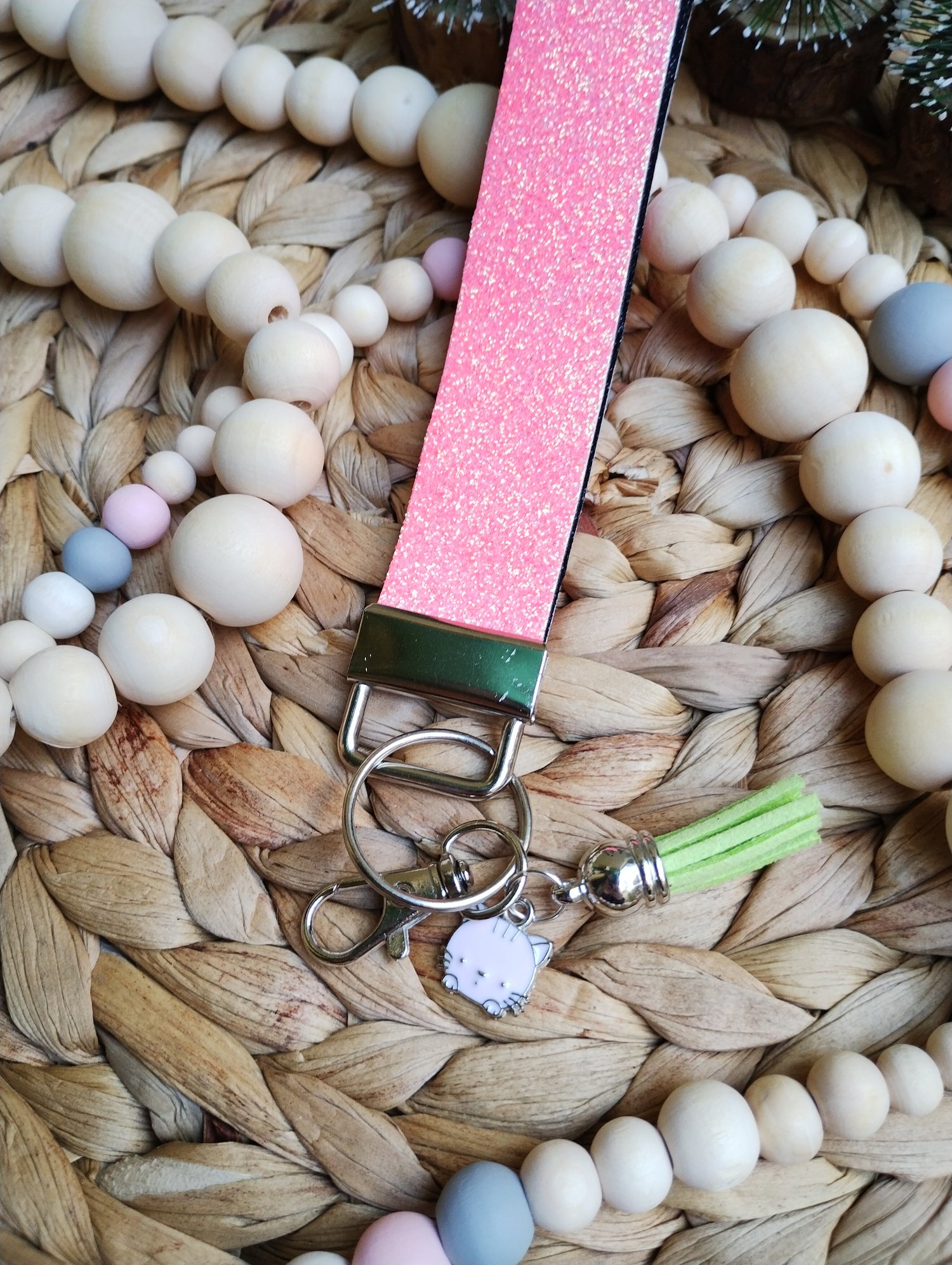 Il braccialetto portachiavi è ornato da un ciondolo, una nappina e un gancio girevole in acciaio.