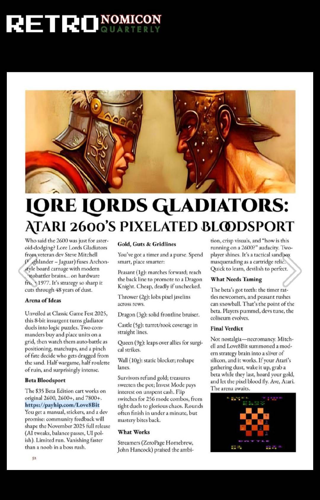 Lore Lords Gladiators "CGF" Beta Edition is compatible with Atari 2600/7800 and Plus Consoles!
