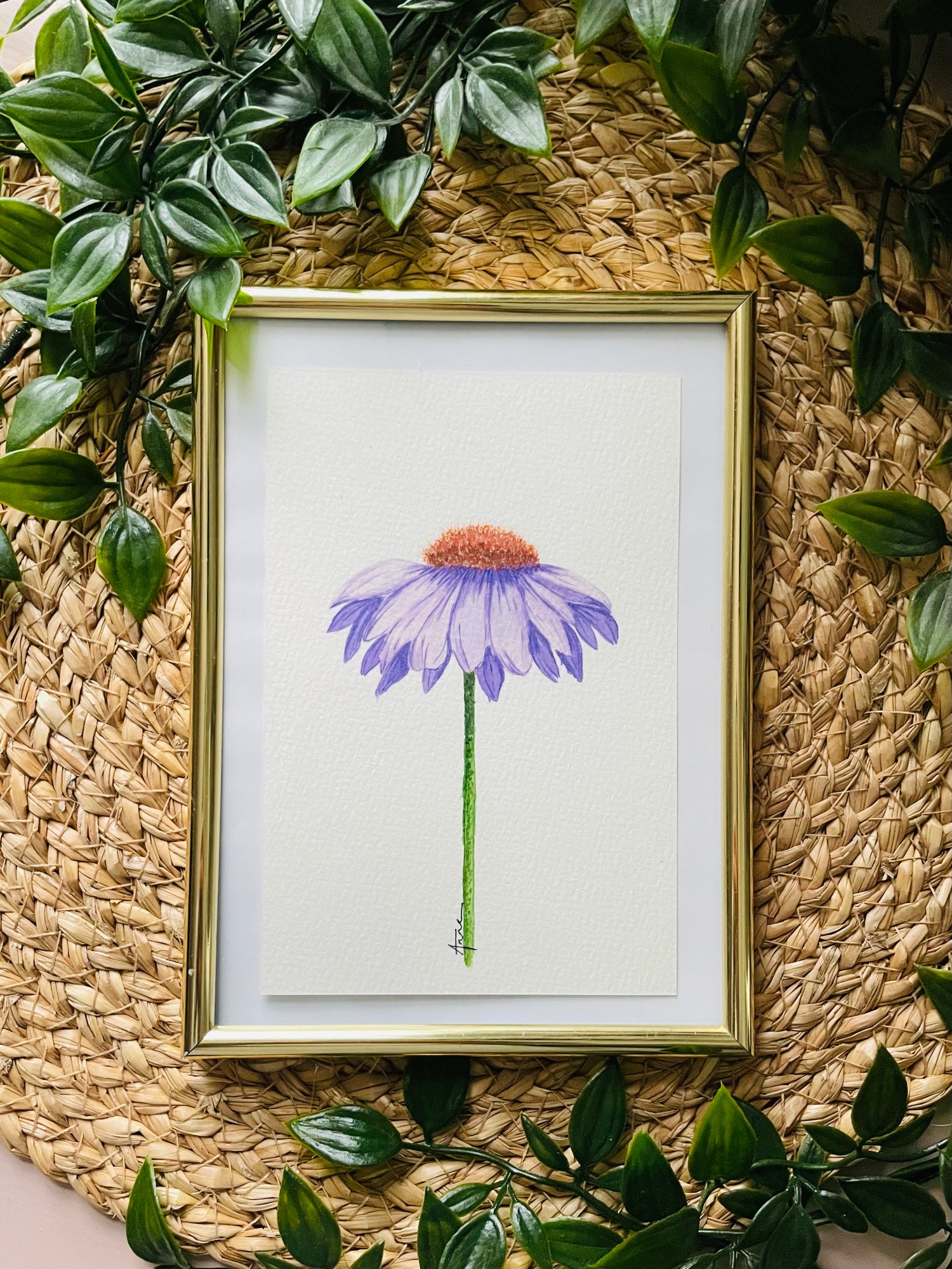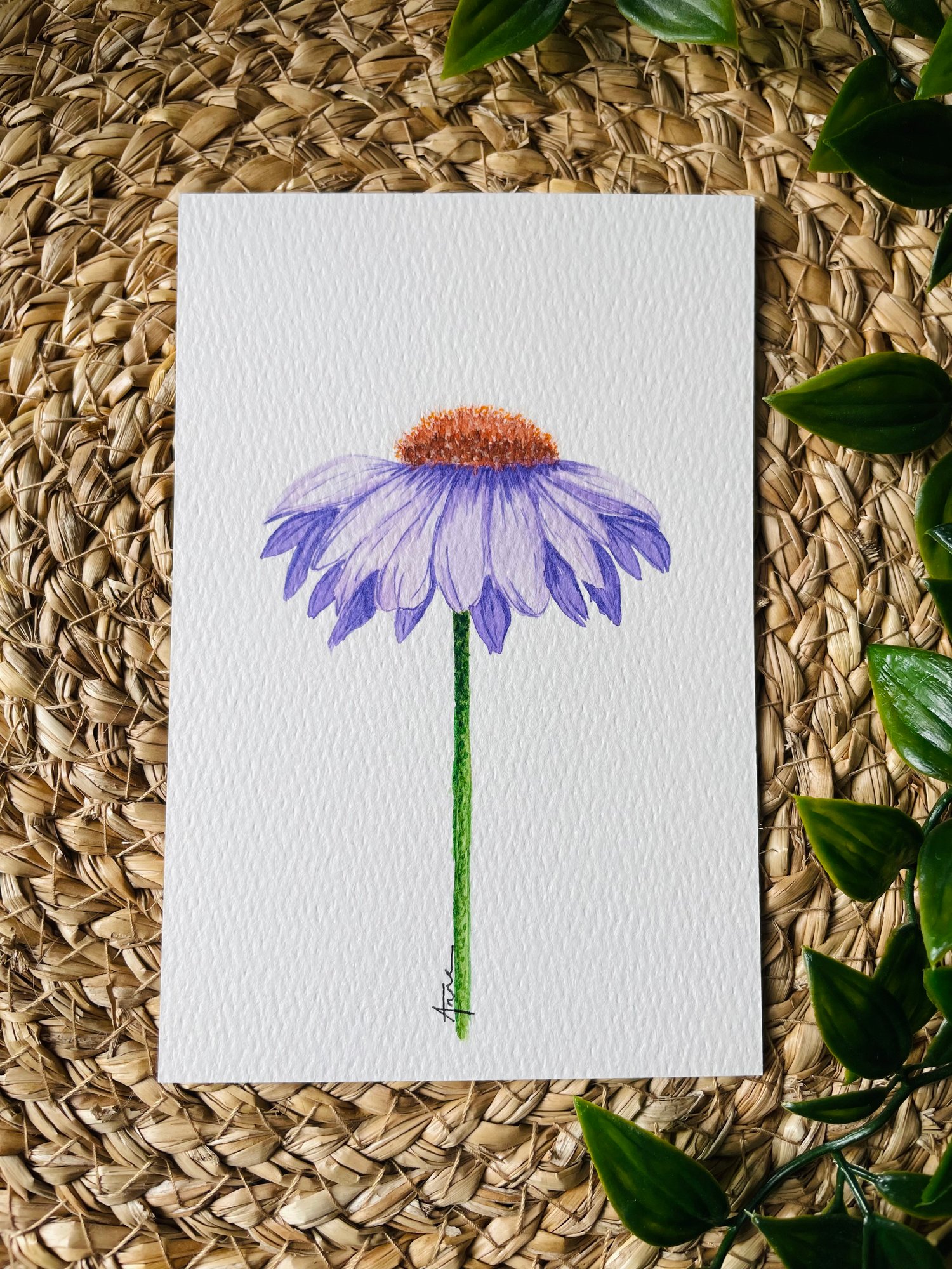 A single daisy, viewed head-on, painted in soft, layered shades of violet—each petal unfolding with quiet clarity. The bloom stands alone, not lonely but fully present, balanced in its stillness. This piece is a moment of solitude—not silence—where presence speaks without sound.