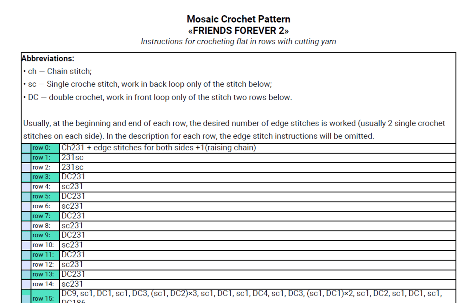 - Written pattern, row by row in PDF