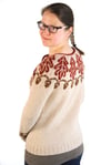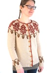 Deriving its name from the Finnish word for acorn, Terho Cardigan is a three-color DK-weight colorwork cardigan with oak leaves and hanging acorns on the round yoke. The cardigan is worked seamlessly in the round from the top down, then steeked in the end to form an opening for the front.