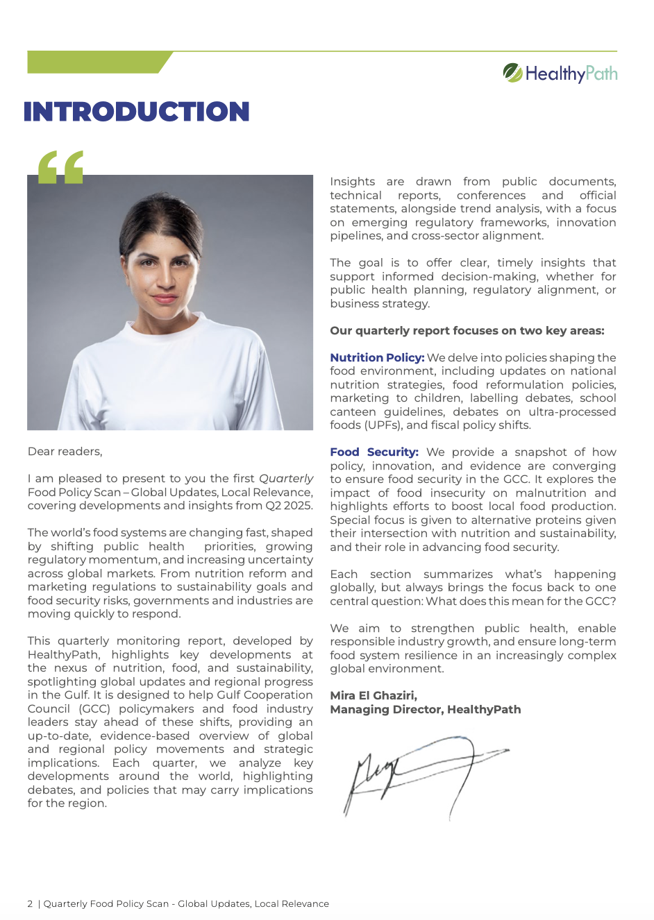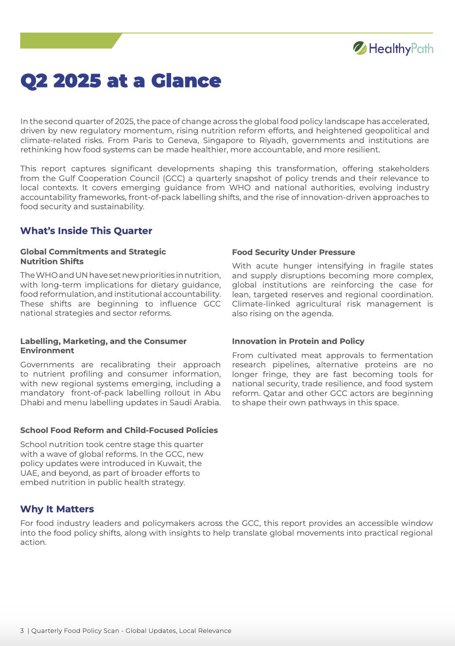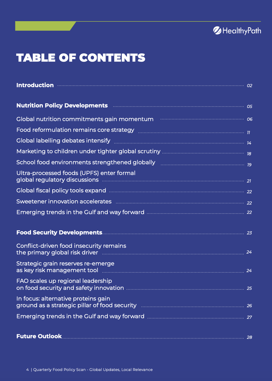 The Quarterly Food Policy Scan – Global Updates, Local Relevance, is a quarterly monitoring report, developed by HealthyPath, intended to highlight key developments at the nexus of nutrition, food, and sustainability, spotlighting global updates and regional progress in the Gulf.