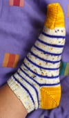 Learn to knit a classic pair of socks from toe to cuff with this pattern and video tutorial. The socks are worked using the two circulars method for knitting small circumferences in the round. They have a mock short-row toe and heel worked in contrasting colors, a striped Stockinette stitch foot and leg, and a k1p1 rib cuff finished with a sewn bind-off. The accompanying video tutorial walks through each of these steps in detail.