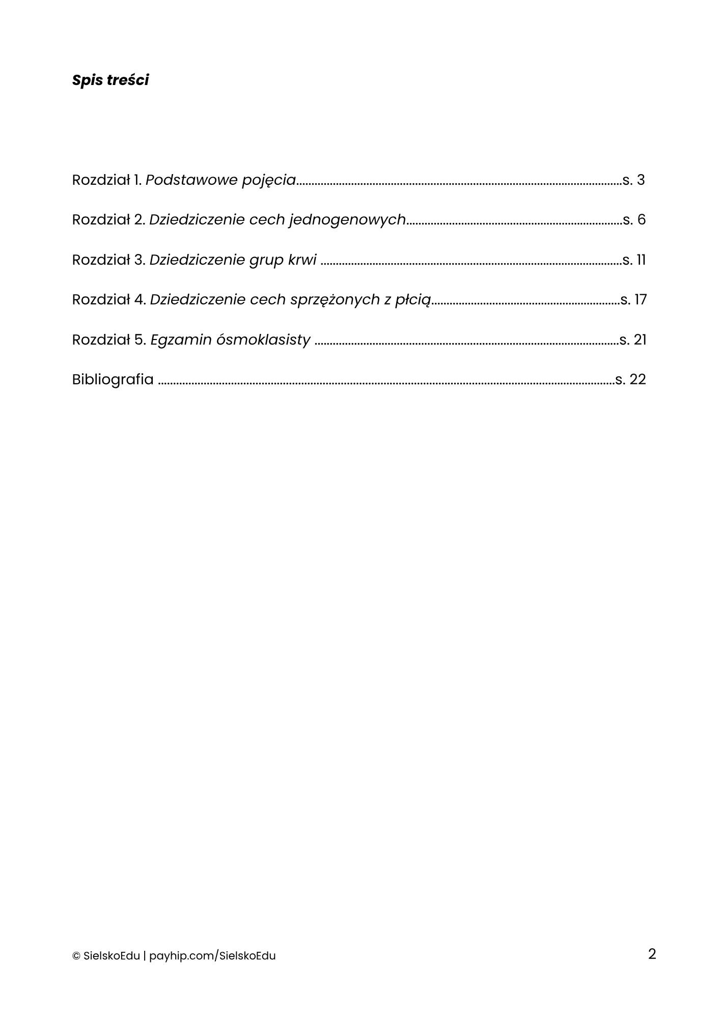 ✓ 5 rozdziałów, a w nich: podstawowe pojęcia, dziedziczenie jednogenowe, dziedziczenie grup krwi, dziedziczenie cech sprzężonych z płcią i porady,