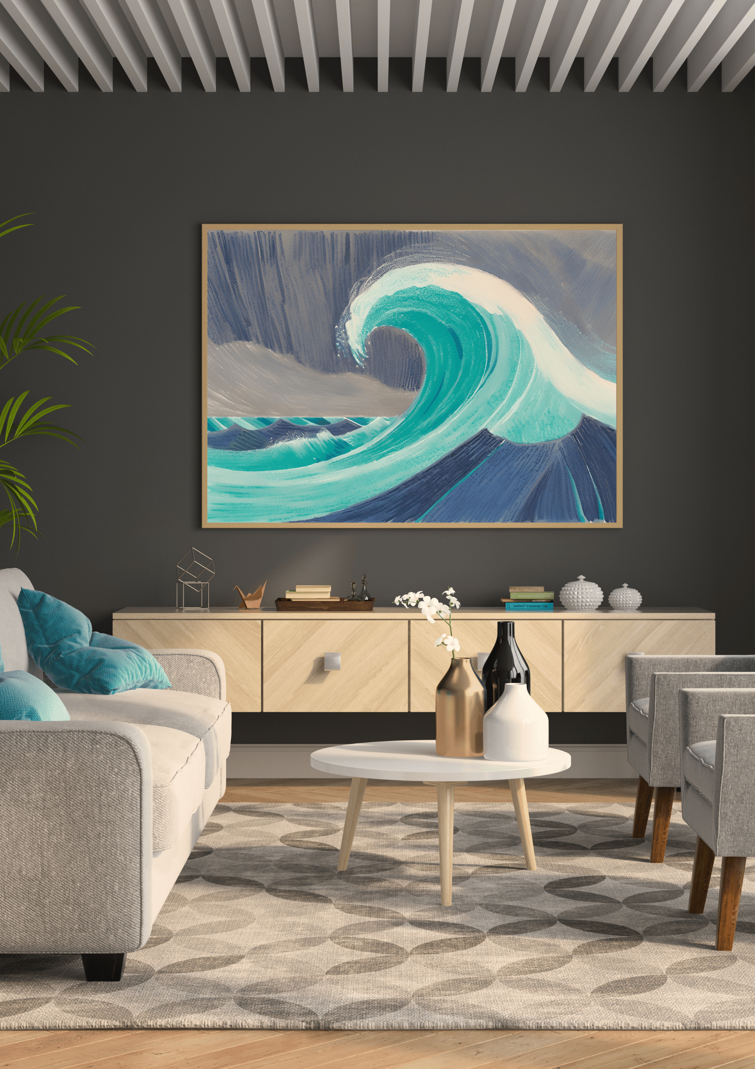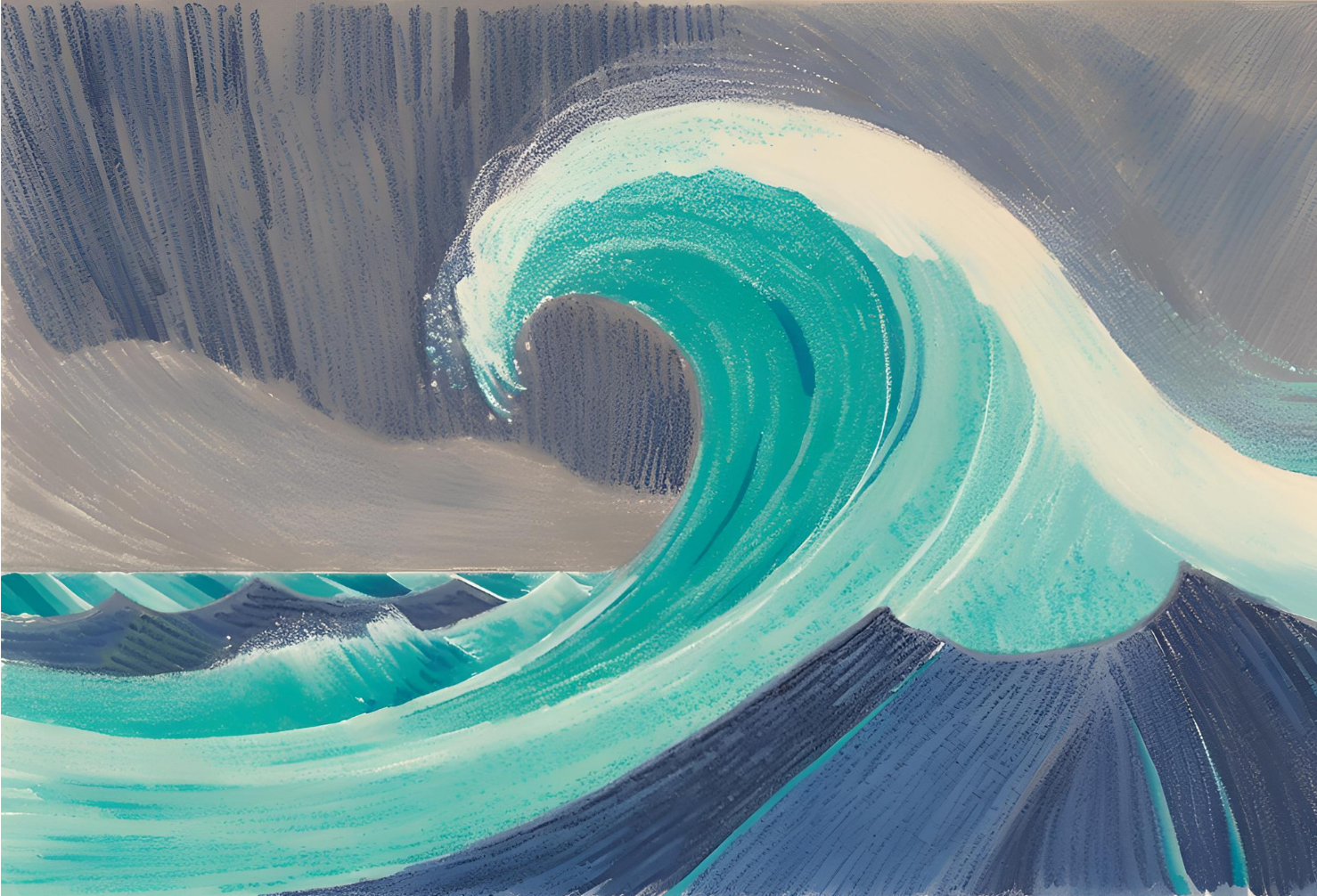"Strokes of the Sea" captures oceanic power with dynamic fluidity, presenting a magnificent wave in its moment of graceful ascent through bold, sweeping brushstrokes. The painting's energetic movement is expressed through layers of emerald green, pristine white foam, and deep navy depths, with silvery highlights that catch the light like crystalline spray. The artist's confident gestural technique and flowing color transitions evoke a sense of natural rhythm and untamed beauty, inviting viewers to feel the pulse and motion of this eternal dance between water, wind, and artistic expression within this vibrant, sea-swept canvas.