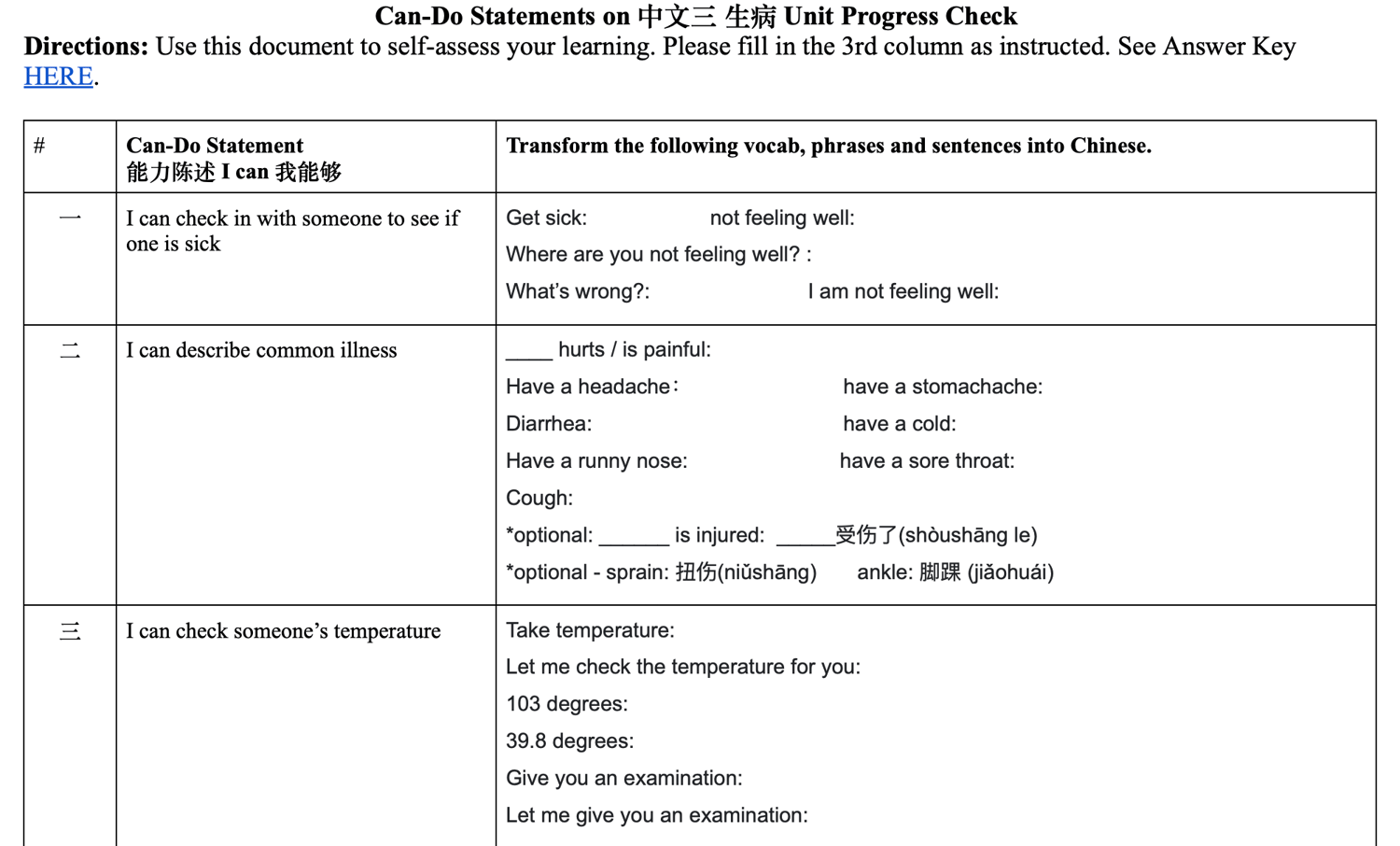 Progress Check是一个结合了Can-Do Statements和学生自测为一体的教学两用文档。第二列是这个单元的Can-Do Statements,第三列是要达到这个学习目标所需要的具体的生词,短语和例句。