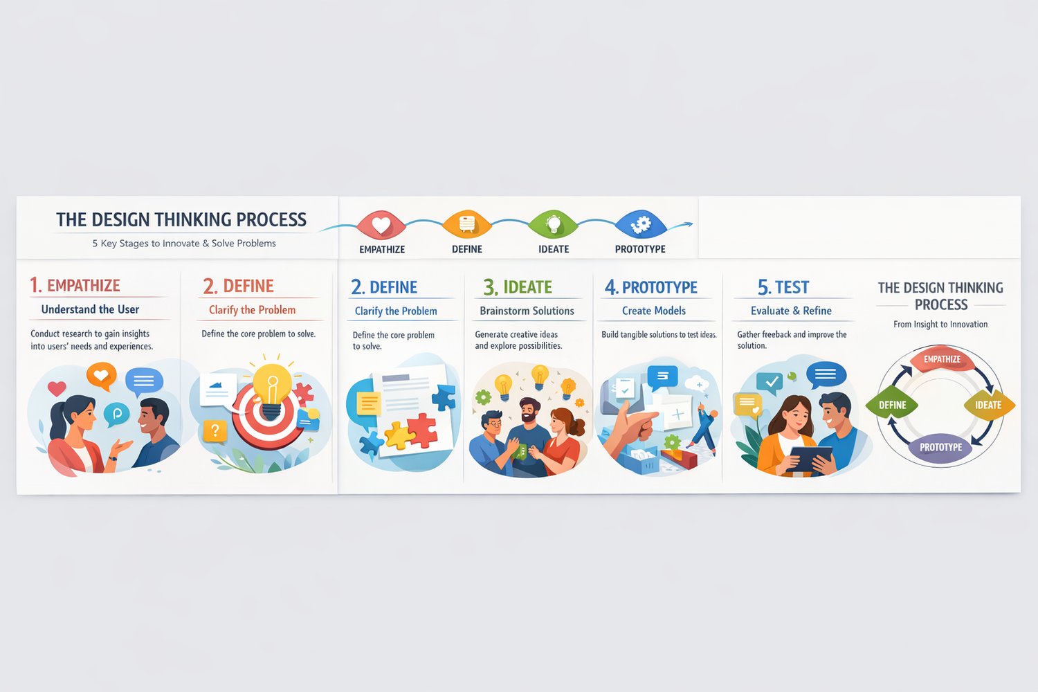 The carousel presents the five core stages of Design Thinking—Empathize, Define, Ideate, Prototype, and Test