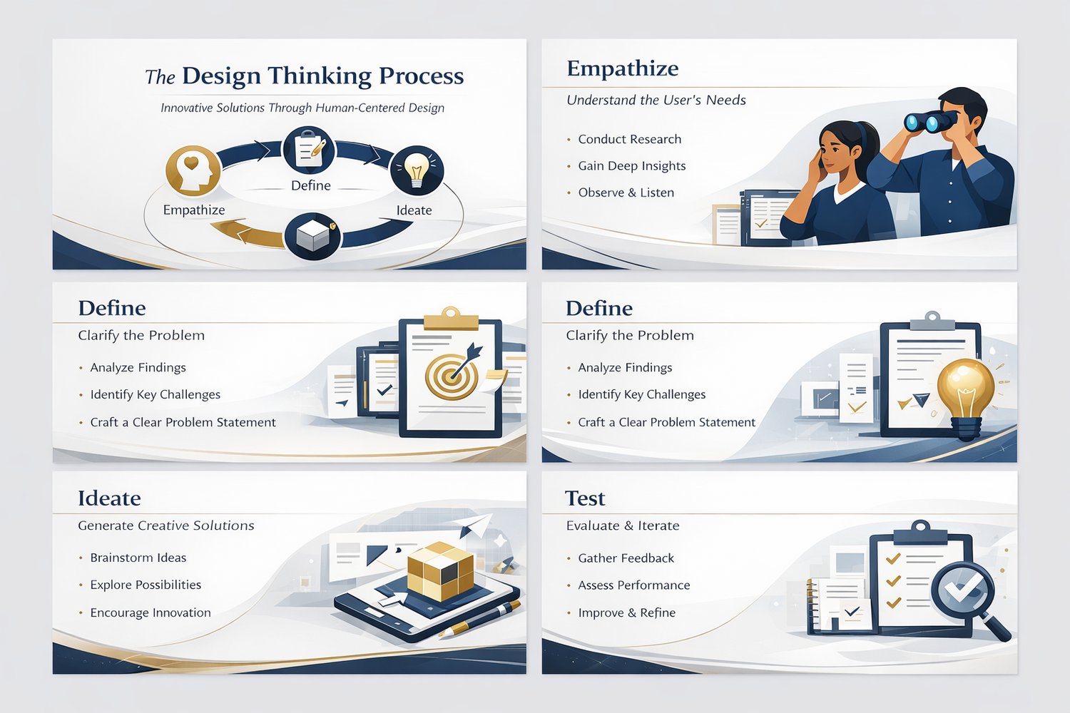 These images showcase a high-end Design Thinking Process, crafted with executive clarity and minimalist sophistication. The visual language is clean, structured, and authoritative—designed to communicate complex ideas with ease and elegance.
