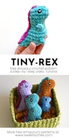 Tiny-Rex the Pocket Dino is the cutest little T-Rex you’ll ever meet! This mini dinosaur doll is a quick, easy, and no-sew amigurumi, meaning it’s made in one piece! A full video tutorial is included, making this a very beginner-friendly project. It’s recommended to use super bulky chenille velvet or blanket yarn. For a tinier keychain size, you can use worsted weight or thinner yarns!