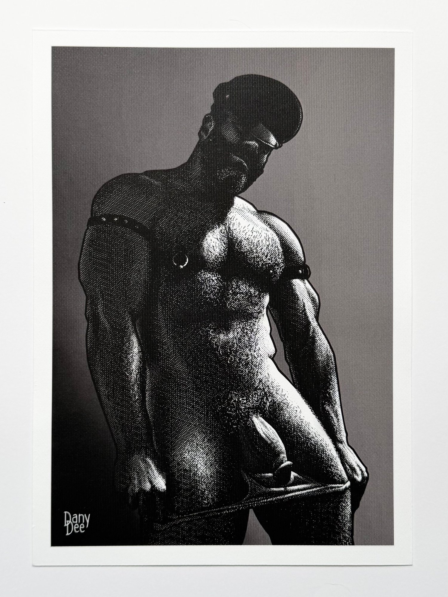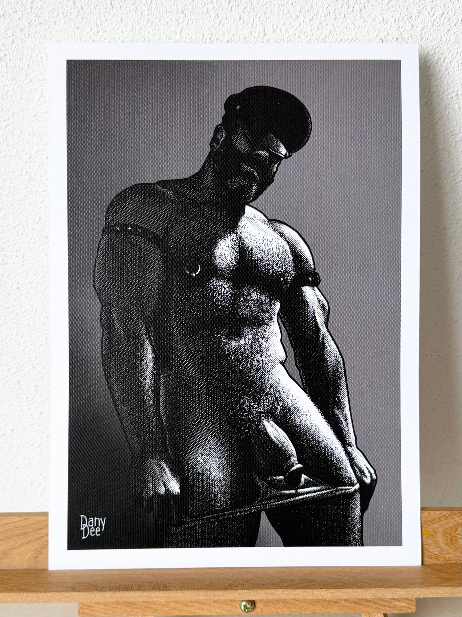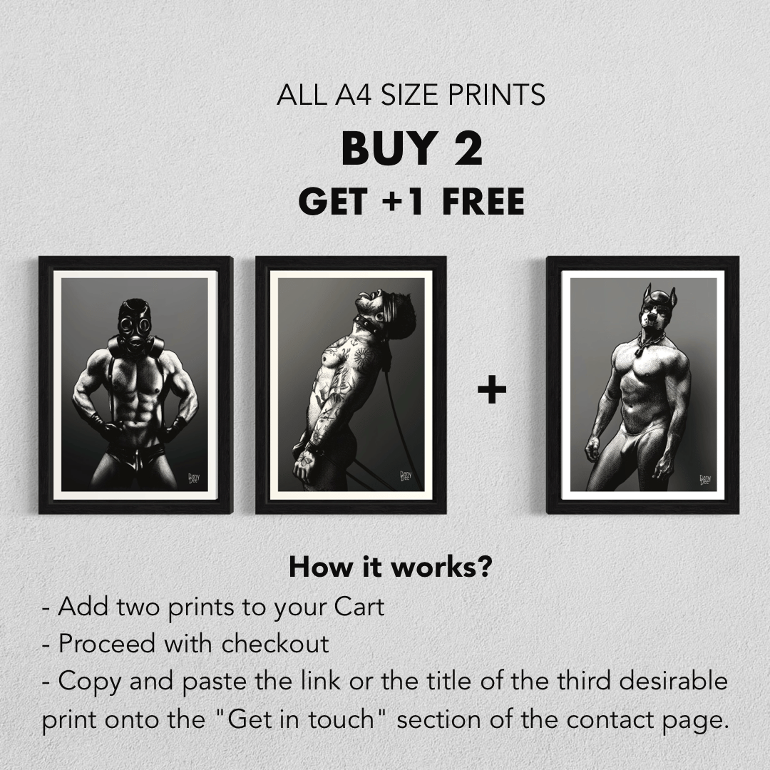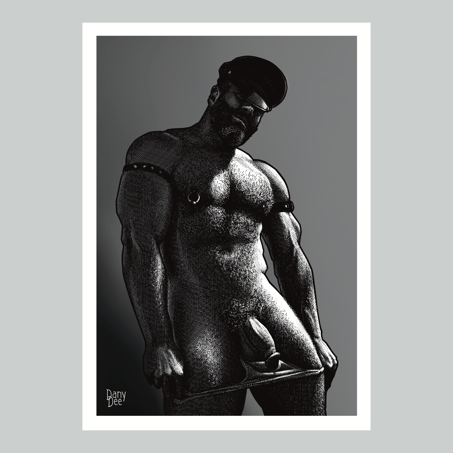 "The Bear" is a hand-drawn, monochromatic A4 art print celebrating gay bear culture — a bold homoerotic illustration of a heavyset, hairy bear daddy in a leather cap slowly undressing, perfect for gay bear art collectors or as a queer home decor gift.