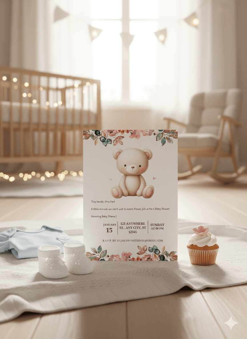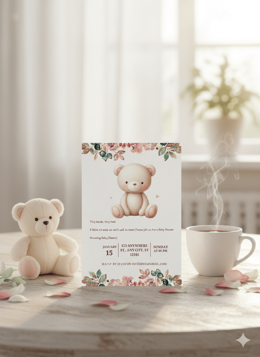Celebrate your little miracle with this adorable watercolor teddy bear baby shower invitation template. Features a sweet sitting bear with soft pink and teal floral accents, perfect for baby showers.