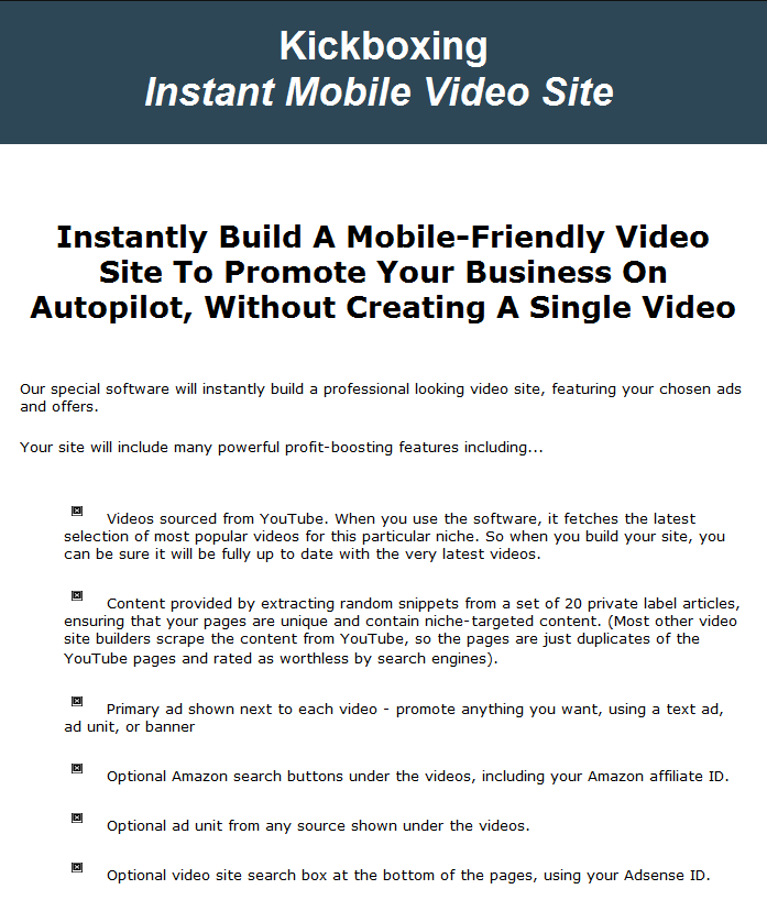 Ready to reach kickboxing enthusiasts and grow your fitness business? Our Kickboxing Mobile Video Site Builder package provides you with a powerful, automated solution to promote your kickboxing classes, gym, or related business to a massive mobile audience.