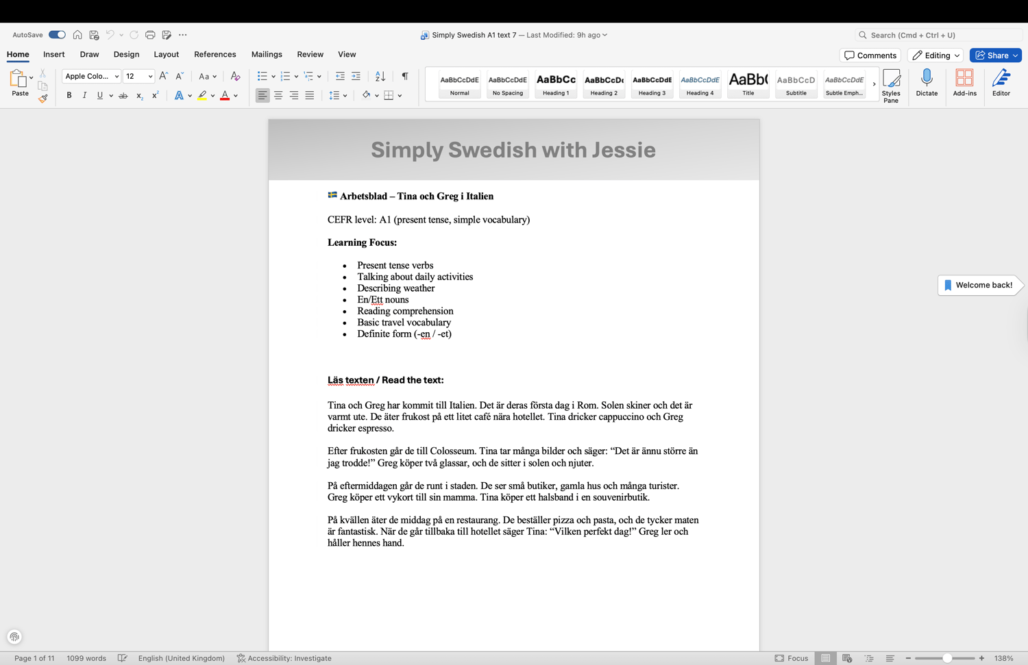 This beginner-friendly Swedish worksheet is designed for A1 learners and focuses on present tense verbs, everyday vocabulary, and reading comprehension through a short, engaging story.