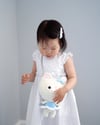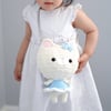 Crochet an adorable crossbody bag that looks like a huggable amigurumi doll! This fun, animal themed purse is in the shape of a kitty cat wearing a cute dress and a bow on her head. It is easily customizable with different yarn colors and appliques. It is unisex as you can also turn the doll into a “boy” version by leaving out the dress skirt portion and changing yarn colors to create the look of pants and a shirt.