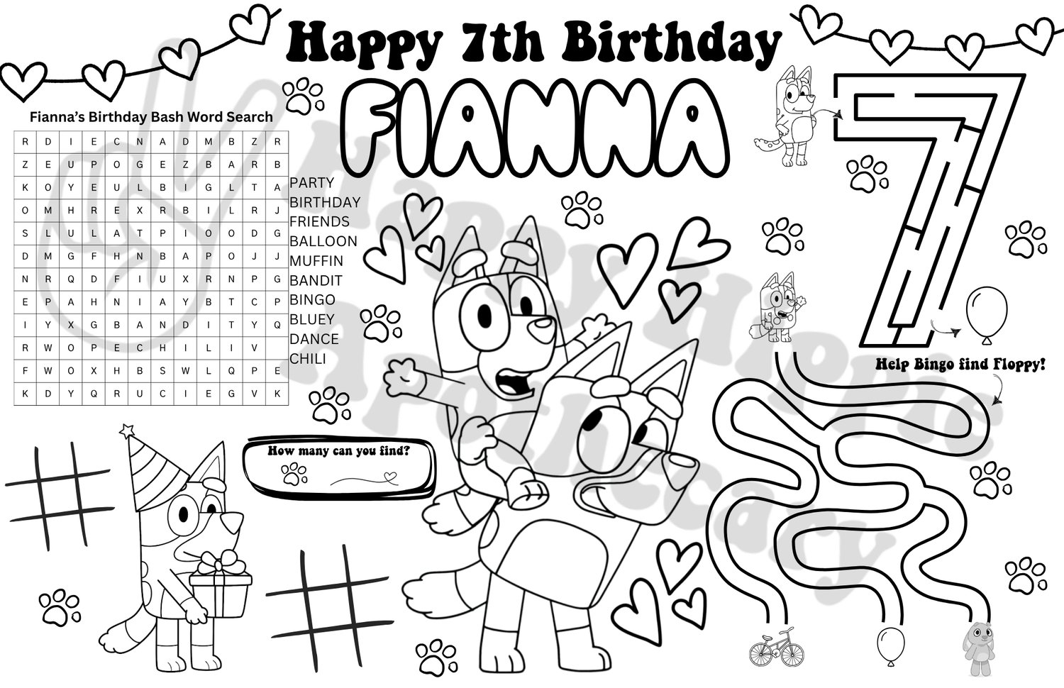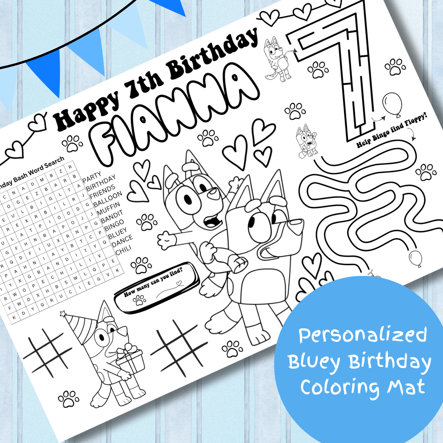 Make your child’s birthday extra special with a Bluey-themed personalized coloring mat that’s just as fun as their celebration! 💙🎉 This interactive Birthday Activity Page is tailored with your child’s name and age, and features age-appropriate games for older kids who love Bluey and her crew!