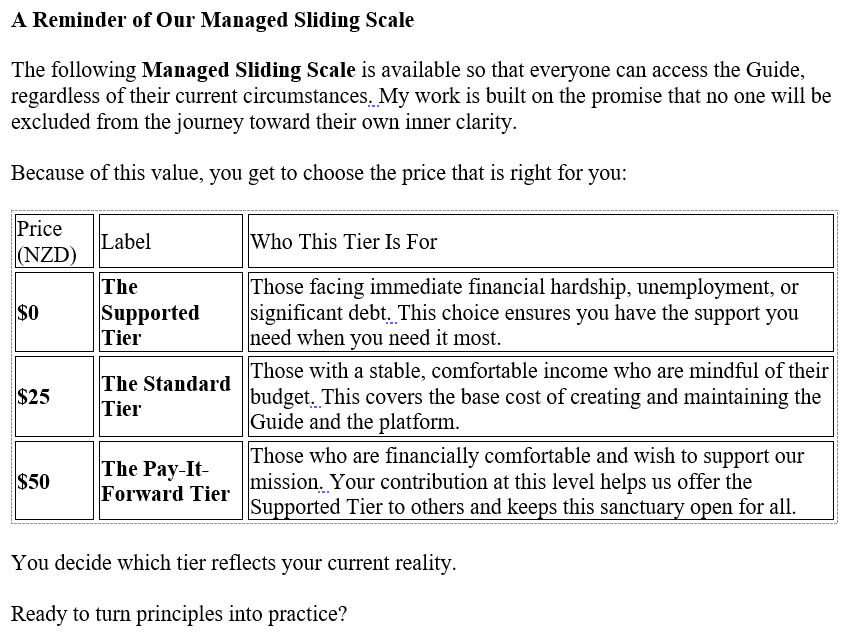 Choose the price that reflects your current reality using my Managed Sliding Scale below. As always, my mission is built on the promise that no one will be excluded from their journey toward inner clarity.