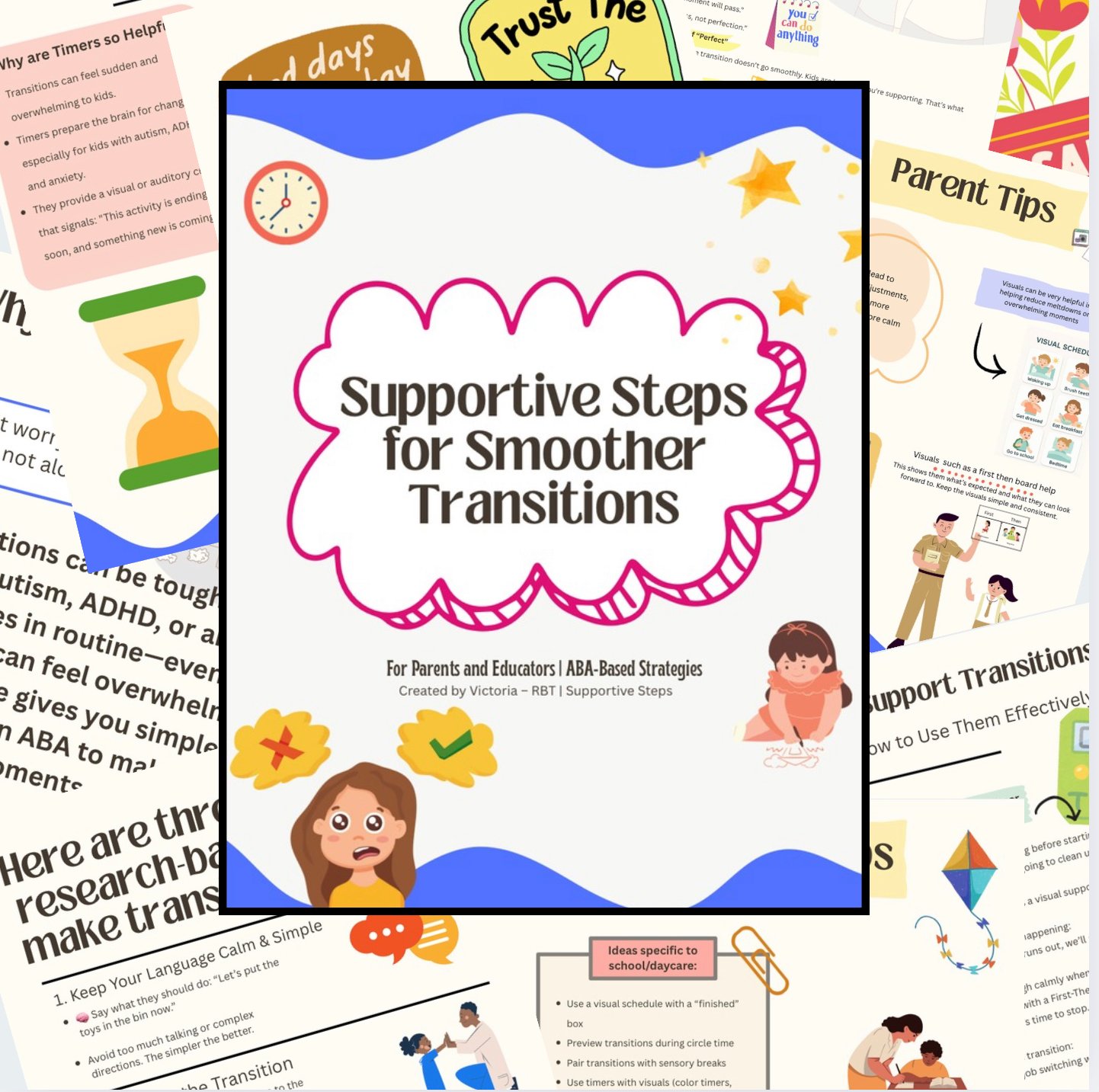 This printable Transition Guide was created by Victoria, RBT and founder of SupportiveSteps, to support children who struggle with shifting between activities—whether it’s going from play to clean-up, school to home, or one classroom to the next.