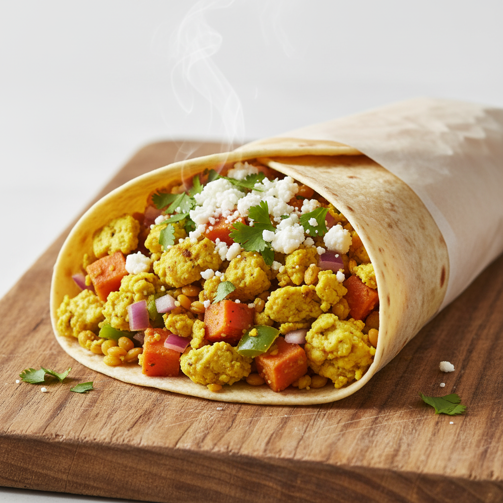 Our plant-powered Scrambled Tofu Breakfast Burrito delivers savory vegan “eggs”, scrambled with diced red onion, sweet potato, and bell pepper alongside soaked yellow lentils. Finished with crumbled vegan feta and fresh cilantro, it’s wrapped in a large flour tortilla for a hearty, high-protein start (15g+ per serving).
