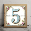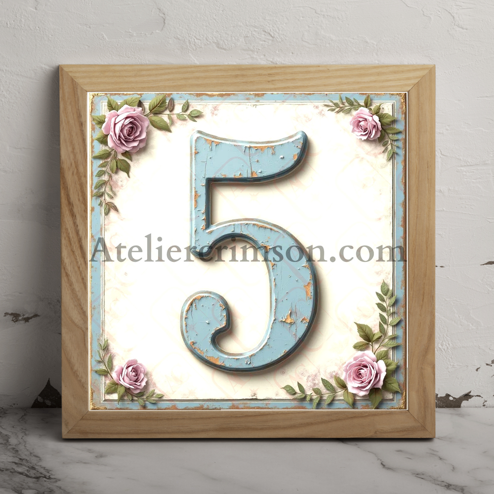 Number 5 shabby chic blue a work of art in soft pastel blue. These elegant characters, reminiscent of weathered painted wood, stand out against a delicate off-white background with subtle floral accents. Perfect for vintage-inspired home decor, DIY projects, or creating unique, personalized gifts with a touch of timeless elegance.