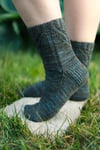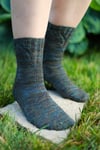Rocky Fork Socks feature a traveling ribbed detail at the cuff, followed by lots of stockinette for an easy and quick knit. These socks are knit from the cuff down with a traditional heel flap and gusset in fingering weight yarn. Each of the 5 sizes has a slightly different look at the side of the cuff - illustrations are included to show you exactly what to expect for your size!