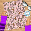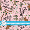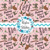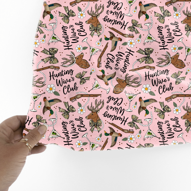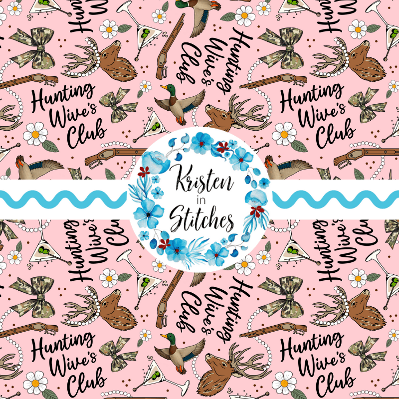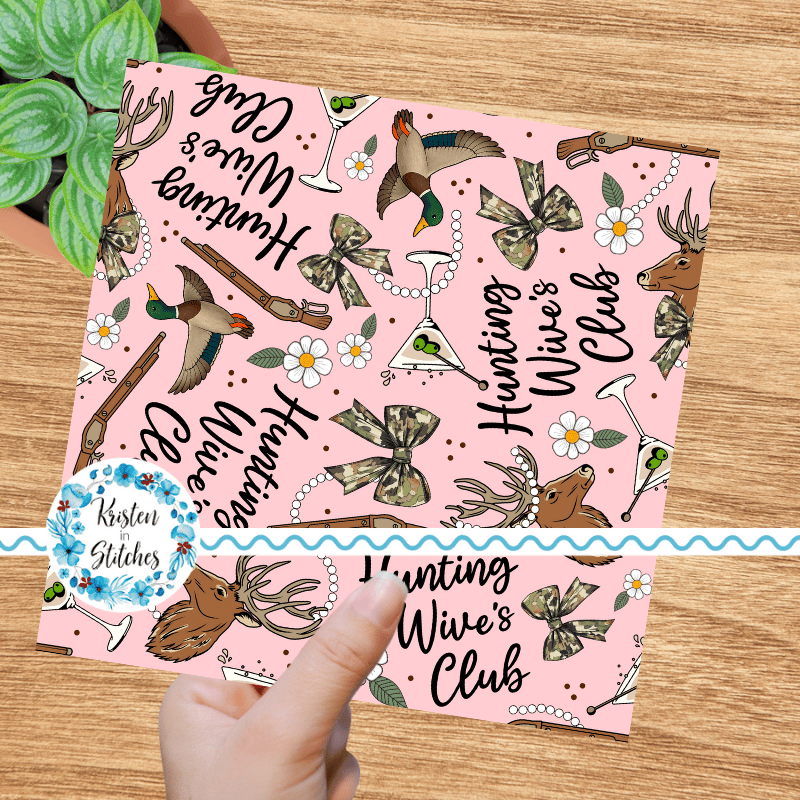 Inspired by the Hunting Wives series, featuring camo bows, deer antlers, ducks, martini glasses, pearls and flowers on pink.