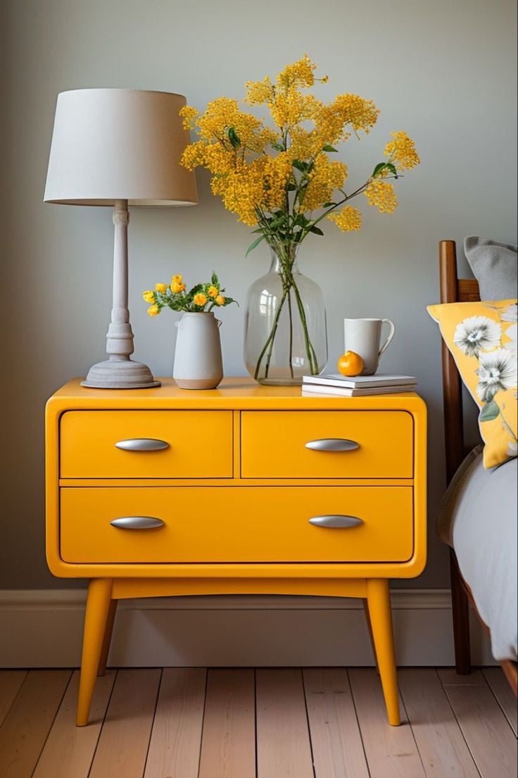 Add a pop of sunshine to your bedroom with this cheerful yellow nightstand styled with fresh florals, minimal decor, and cozy accents. Perfect for creating a warm, uplifting, and modern vibe in your home. A balance of bold color and simplicity for anyone who loves vibrant yet minimalistic home décor.