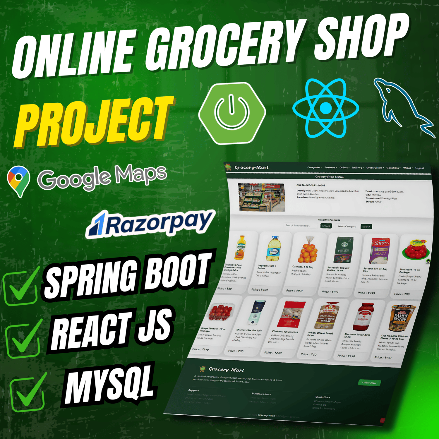 Build a complete full-stack Online Grocery Shopping System Project Source Code using Java Spring Boot (backend), React JS (frontend), and MySQL (database) with Razorpay payment gateway and Google Maps integration for your final year, internship, or capstone project.