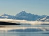 The majestic Aoraki Mt Cook and beautiful Lake Pukaki with a line of fluffy white cloud along the bottom of the mountain and a reflection in the lake.