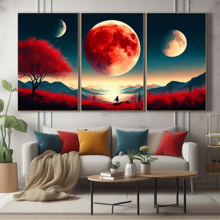 Transform your space into a cosmic dreamscape with this stunning 3-piece digital wall art set. Featuring an otherworldly moonrise over a glowing valley of crimson trees and silhouetted mountains, this artwork brings depth, color, and imagination to any room.