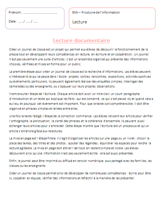 Les Ă©lĂšves se mettent en situation de producteurs dâinformation : journal de classe, podcast, reportage photo, interview et article court, tout en dĂ©veloppant des compĂ©tences essentielles en Ă©criture, oral, organisation et esprit critique.