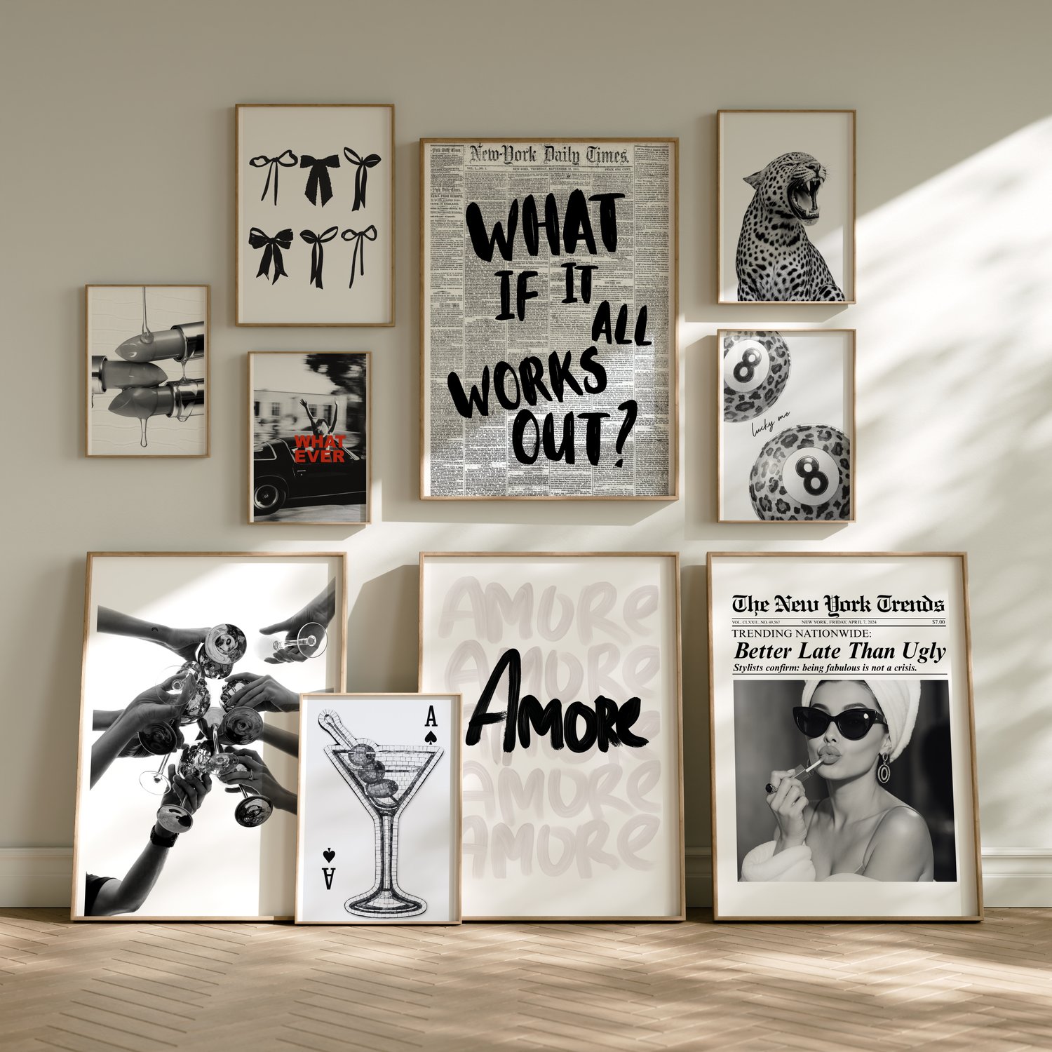 This 12+ print monochrome wall art bundle is curated for lovers of black & white interiors, bold statements, and effortless cool-girl energy. Featuring fashion photography, typography, leopard accents, affirmations, and graphic elements — this set is perfect for a sleek, modern gallery wall.