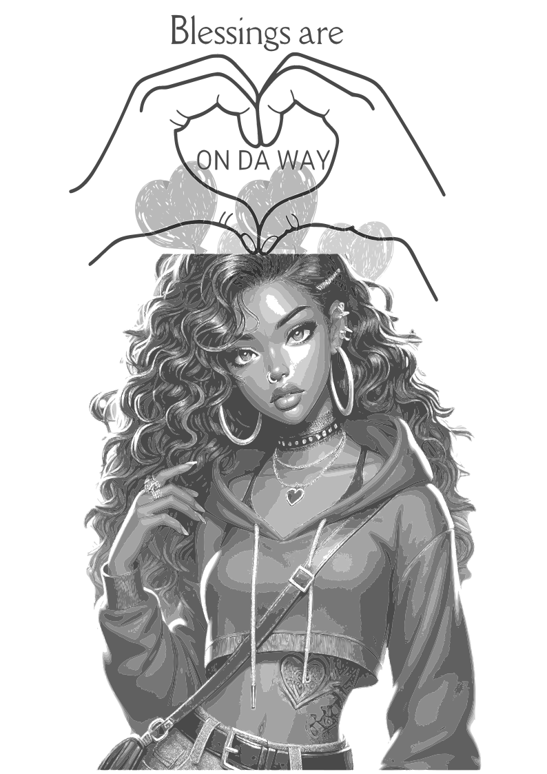 This high-resolution transparent PNG features a stylish, modern illustration of a confident woman with bold curls, statement jewelry, and intricate tattoos. Above her, elegant hand-drawn hands form a heart shape surrounding the phrase “Blessings are On Da Way”, delivering an uplifting and positive message.