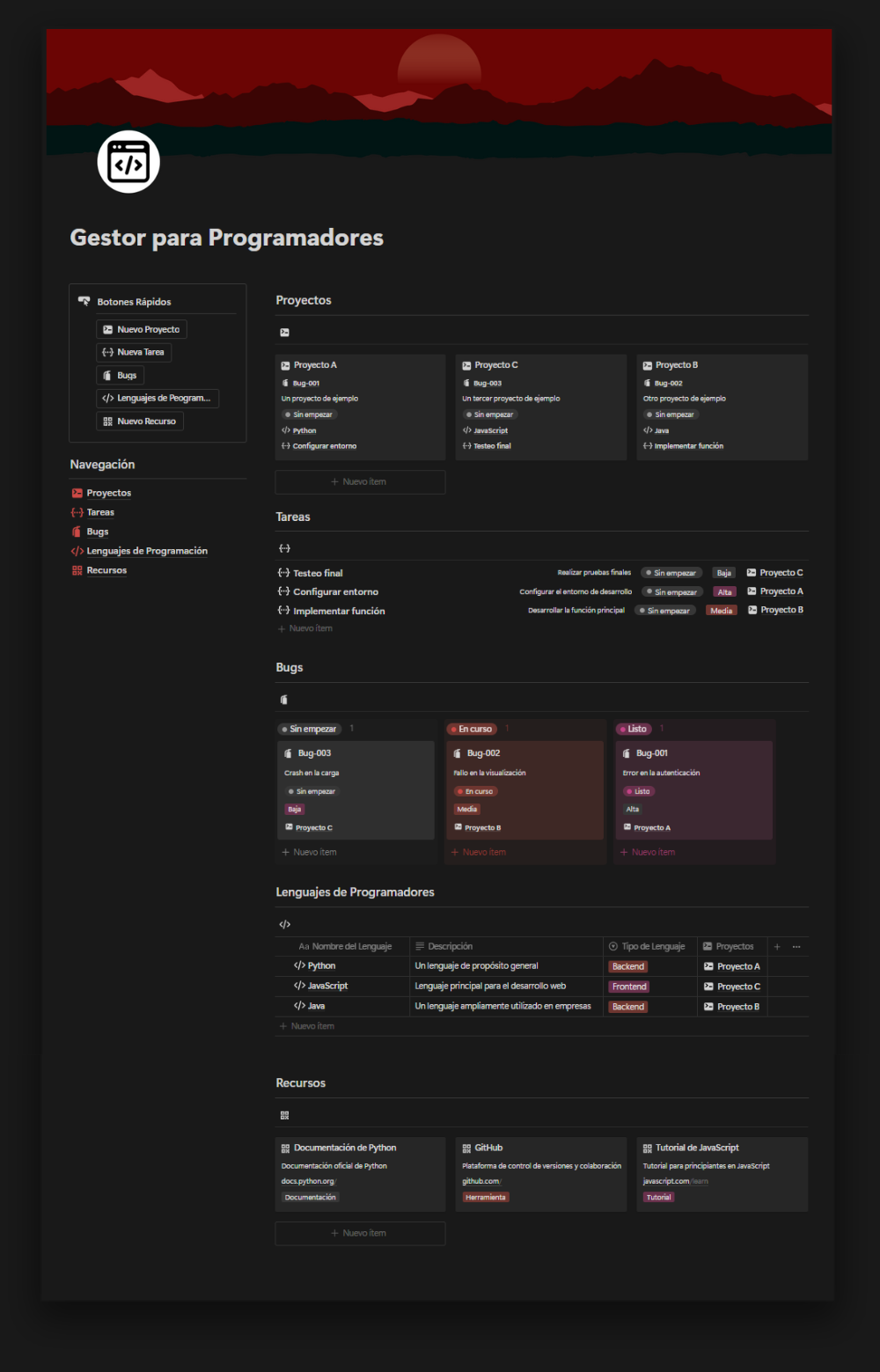 - Recursos: Centraliza todos tus recursos importantes, desde documentación y enlaces útiles hasta herramientas y bibliotecas de código. Accede fácilmente a todo lo que necesitas para tu trabajo.