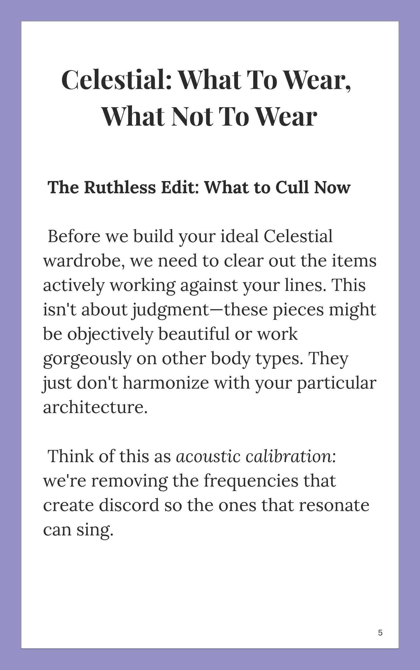No generic “body type” prescriptions. This is acoustic engineering for your body: identifying your innate lines and dressing in a way that makes fabric and line resonate rather than fight. It’s precise, calmly opinionated, and built from lived analysis — not trends.