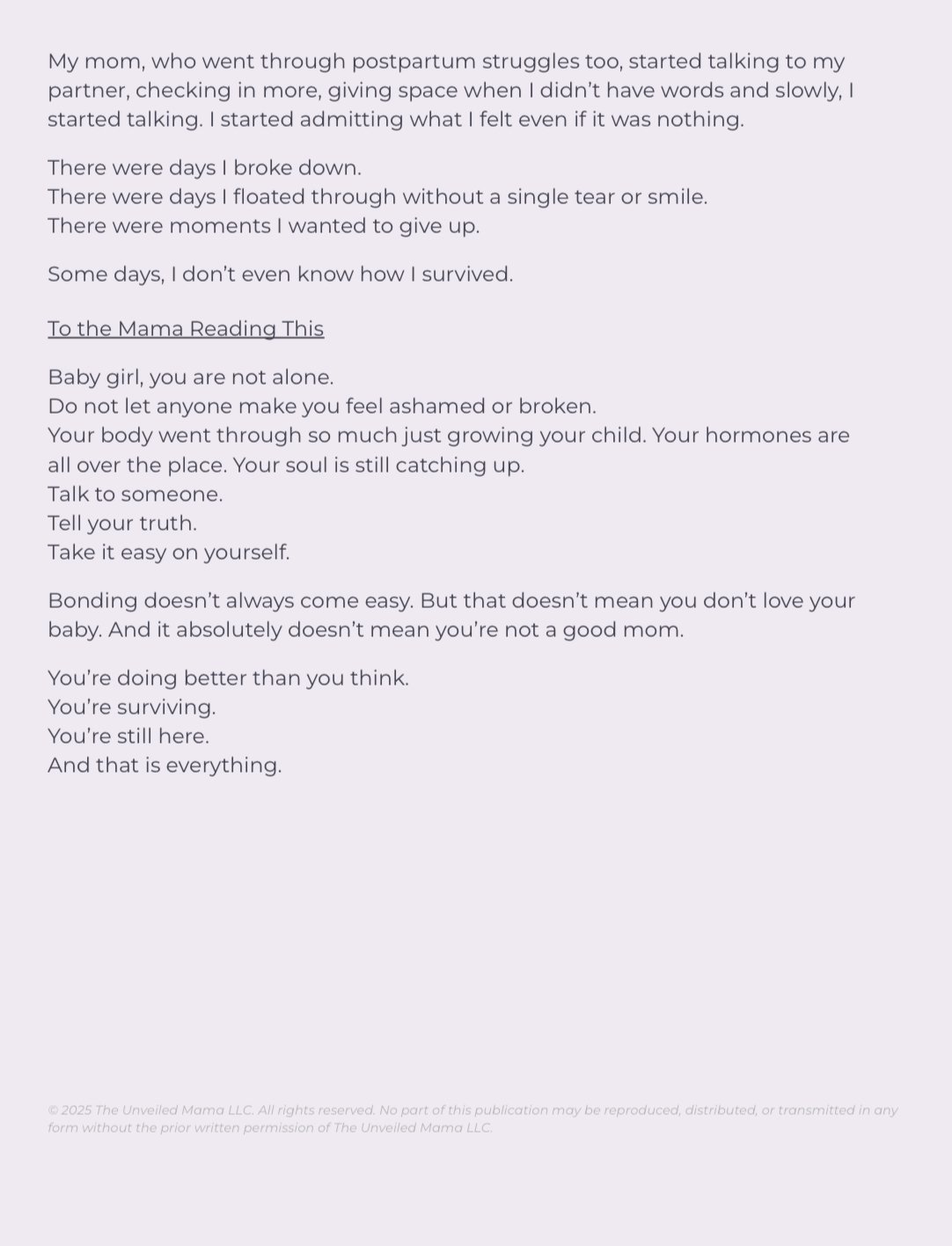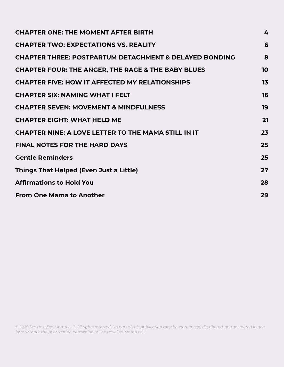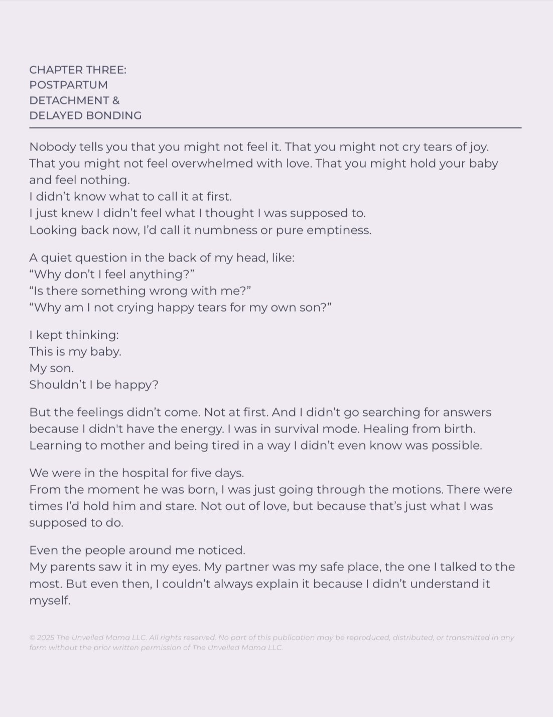 This isn't just an e-book; it's a lifeline for every mom who's ever felt broken after birth. In this unfiltered and brutally honest survival story, a first-time mama opens up about the raw emotions no one talks about: the postpartum rage, the paralyzing numbness, the delayed bonding, and the dark thoughts too many moms carry in silence.