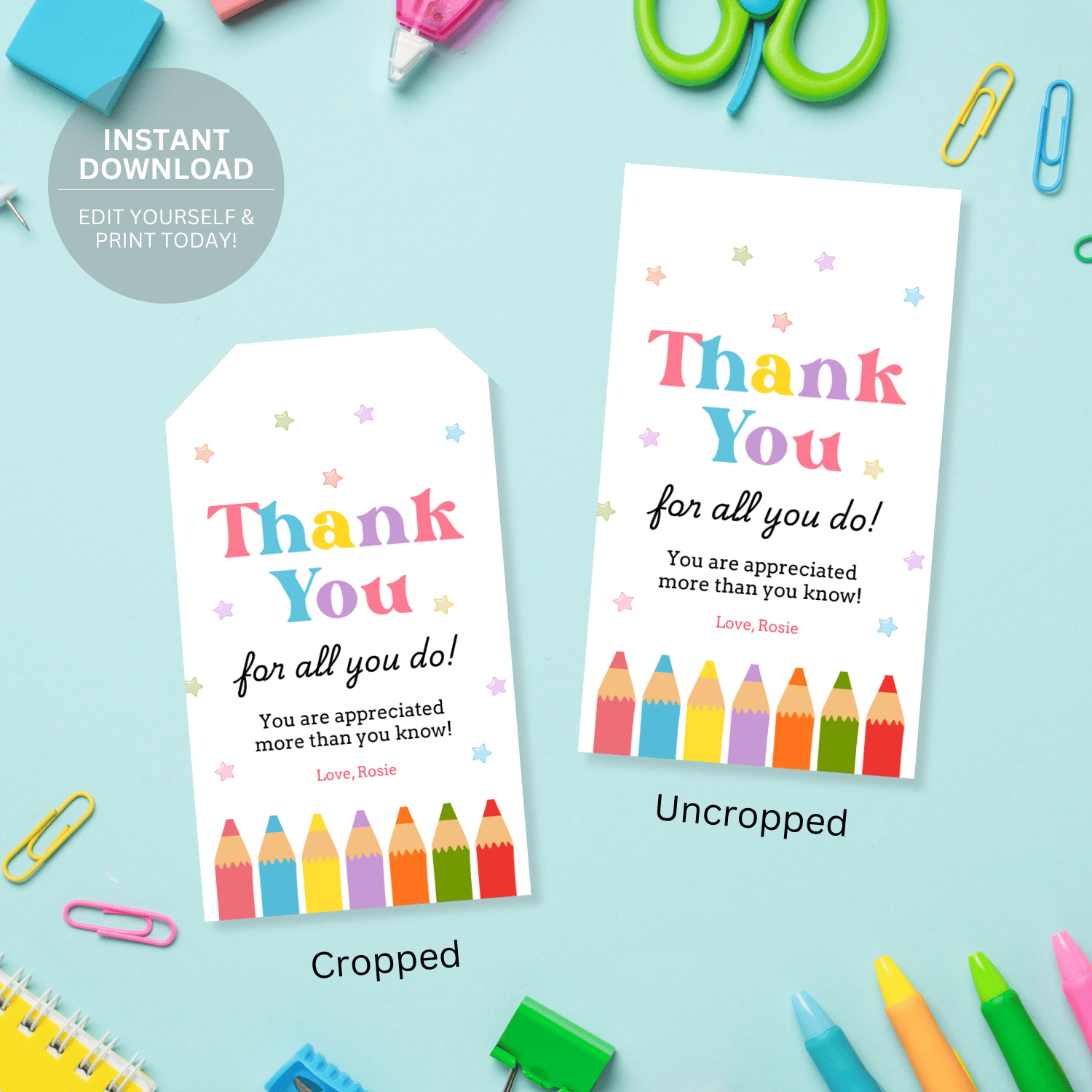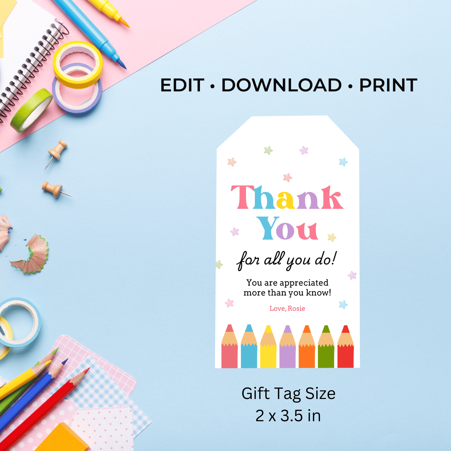 These colorful teacher appreciation tags feature playful stars and vibrant pencil illustrations, paired with the message “Thank you for all you do! You are appreciated more than you know!” — a simple yet meaningful addition to any teacher gift. Perfect for parents, room moms, or anyone who wants a thoughtful thank-you without the stress.