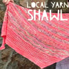 The Local Yarn Shawl is a boomerang shaped shawl, consisting of simple lace, textured, eyelet and mesh stitches. The pattern is written for two sizes: Small and Large. The small shawl only consists of one color but in a gradient if desired (560 yards); while the large shawl uses two contrasting or “blendy” colors (350 yards each.)